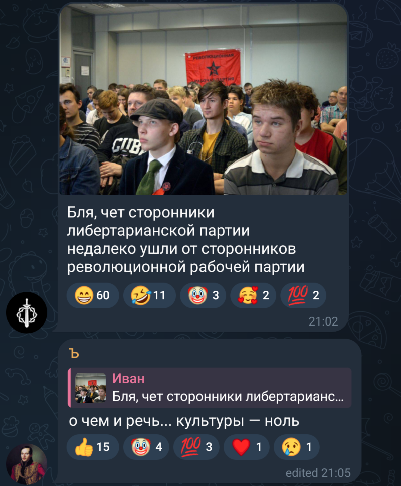 >>936432 >В итоге да - он стал полным говном и шизом из нижних унтернетов Как раз он более менее мейнстримным стал (по крайней мере на уровне риторики), заимствовав мейнстримные нарративы типа ковидобесия, нежелания умирать за барина, нелюбовь в путинской и либерашкинской номенклатуре и тусовочке + откинув свои самые либертарианские шизоположения типа цирка уродов. Другой вопрос, что этому мажорчику до понимания российской действительности еще лет двадцать ползти. >если бы не Либертарианская Партия России Сборище шизов и школьников уровня кичановой с нулевым импактом кроме кринжа.