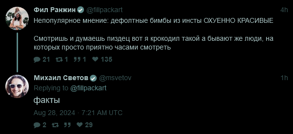 Послушал на фоне последний стрим Светова про слив фабрики эльфов, Ведуту и т.д. Да, ебанулся он на отлично конечно. Минут сорок рассказывал частной организации (на самом деле даже не ей, а просто бомбил в пустоту) о том, как именно она должна работать, кого нанимать, кого увольнять, как называться (!) и т.д. Под конец вообще пригрозил заявами за базар (тайминг не запомнил, но он чётко сказал, что если бы они находились в одной юрисдикции, то он подал бы в суд за "неподобающие заявления").