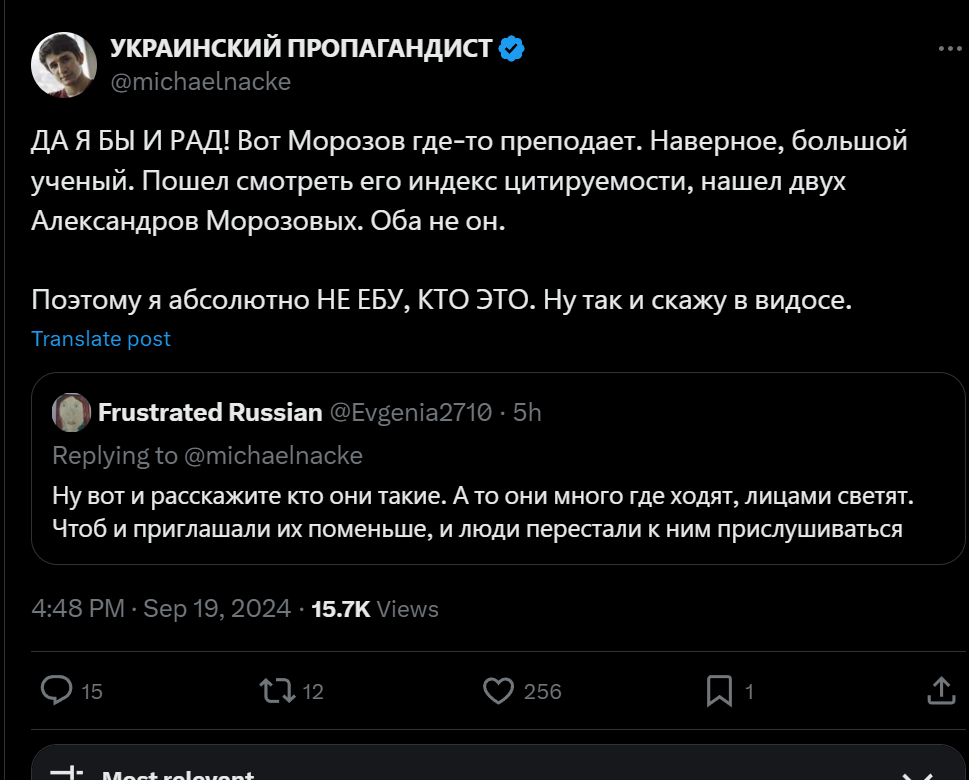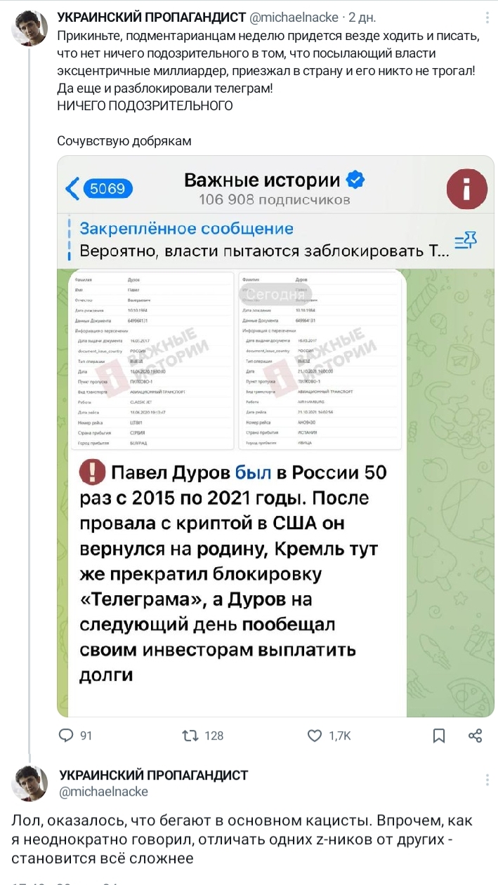 >>937836 Очевидно, потому что публикация этого считается авторами важной? Белое пальто морализаторов за 2 года всех порядком подзаебало, лишняя демонстрация их обосраных штанов только поможет публике понять, что это за контингент и почему их не стоит воспринимать всерьёз. И да, ТП сама приехала сюда, за мамкиными борщами, что намекает на то, что она себя здесь вполне безопасно чувствует.