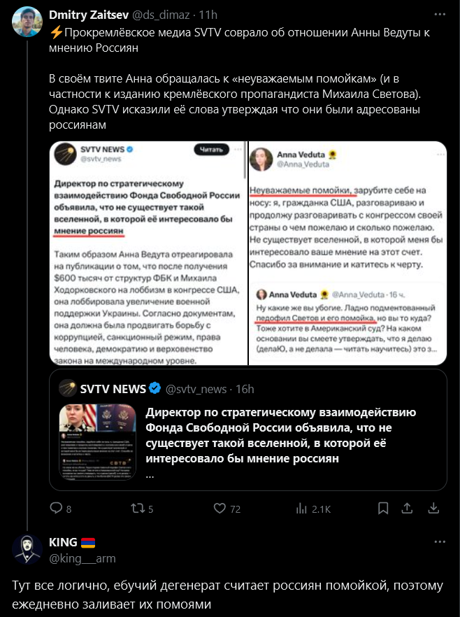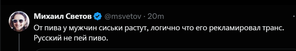 Месяц не смотрел Светова. Щас зашел посмотреть что там несёт этот левачок, включил видео с Маркаряном, услышал от педофила что-то про патриархат(щито? зачем ты используешь термины из левой критической теории?), что этот богатенький пидарок прощает женщинам то чего не прощает мужчинам(нахуя что-то прощать современным натрашкам?), что у него двойные стандарты и что он вот весь из себя такой консерватор из 19 века(соевичок без жены и детей), вспомнил почему перестал смотреть эту лживую леволиберальную сою и ушел смотреть хайлайты Сармата. Всё так прав он был когда говорил что Светов шизик, я думал это фигура речи такая, намёк на глупость, ан-нет. Это не какая-то там сложная многогранная позиция, это просто больное шизло, у которого в одном предложении десять противоречащих друг другу утверждений. Забавно наблюдать как это ссыкло ёрзает, сливается и боится Сармата. Просто чмо, ссыкло и петух.