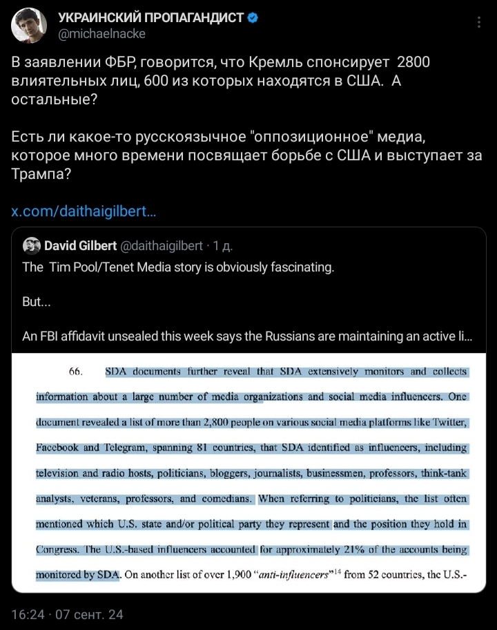 >>945871 >у неё есть список петухов на зарплате у Ходора и Невзлина Светов там есть? Или он бесплатно распространял фэйк Невзлина, что боты ФРФ это боты ФБК?