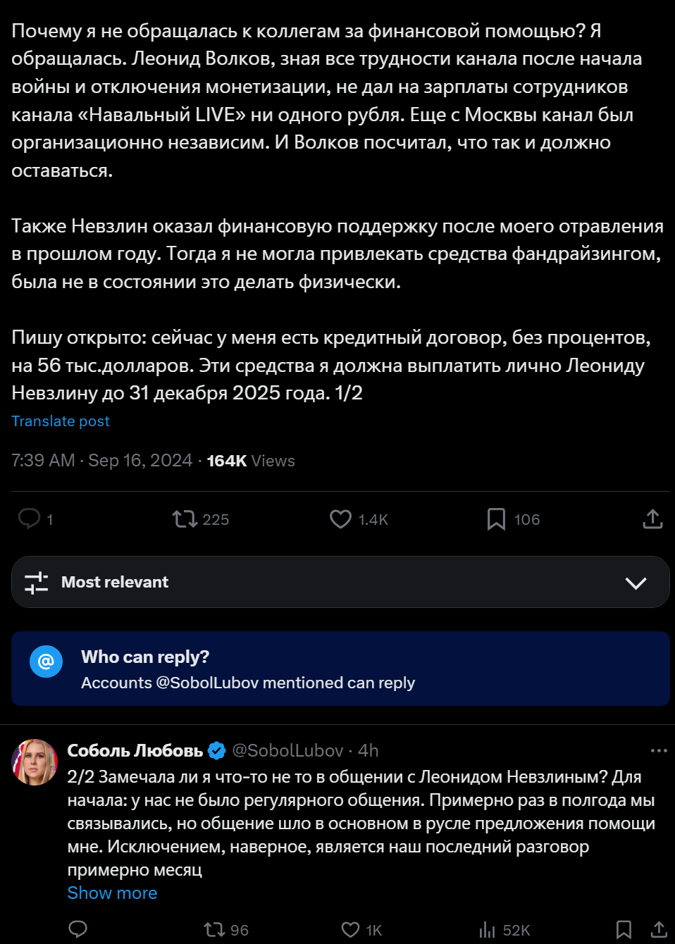 Соболь уже давно отсепарировалась, еще и в мбхшный антивоенный комитет влезла. Поэтому в ФБК вместе со всеми узнали, что она об Невзлина зашкварилась, пусть и в кредит.
