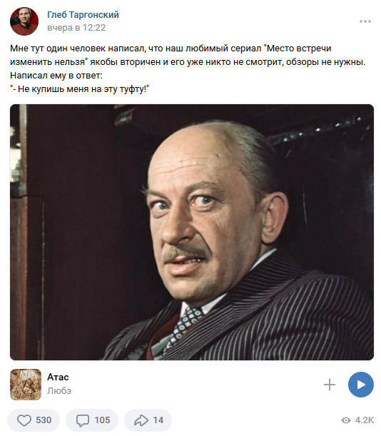 >Умер Роман Мадянов.. если честно, первой мыслью было: освободилась вакансия на роли отмороженных мордатых истеричных НКВД-шников и упырей-генералов.. увы, какие режиссеры и какой госзаказ, таков и путь актера, таким он войдёт в вечность.. Раневская в свое время острила про плевки в вечность.. увы, тут речь идёт о пьяной отрыжке в предков. Очень печально, ведь Мадянов мог сыграть нечто большее, чем "Твоююю мать!!! Ааархх.."