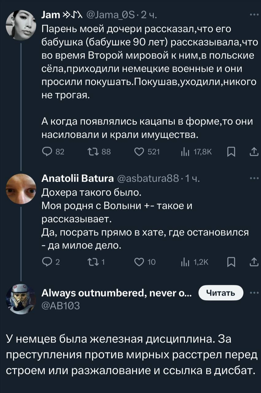 А почему вы говорите что в русском пространстве есть какие то левые, если разобрать дела и тейки это выйдет смесь консервативного евангелиста из США(правый) смешанного с шизом конспирологом из МАГ(ультраправый) с уровнем пещерного шовинизма типичного нациста(ну правее уже невозможно). Западный ультраправый на фоне российского левака умеренный соевый центрист. Да и русский нацист или монархист в плане идей и риторики по левее русского человека называющего себя левым. Может назовёте тред правильно «тред истомных ульраправых» Да и как так вышло то что русские левые это на деле ультраправые фашисты?