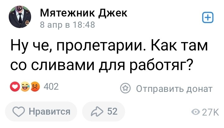 >>949220 Как же стремно, что среди «левых» позиция: капиталисты должны делиться с пролами и это эффективно, считается фигой в кармане. Суслики, блять. Милостыню попрошайничают.