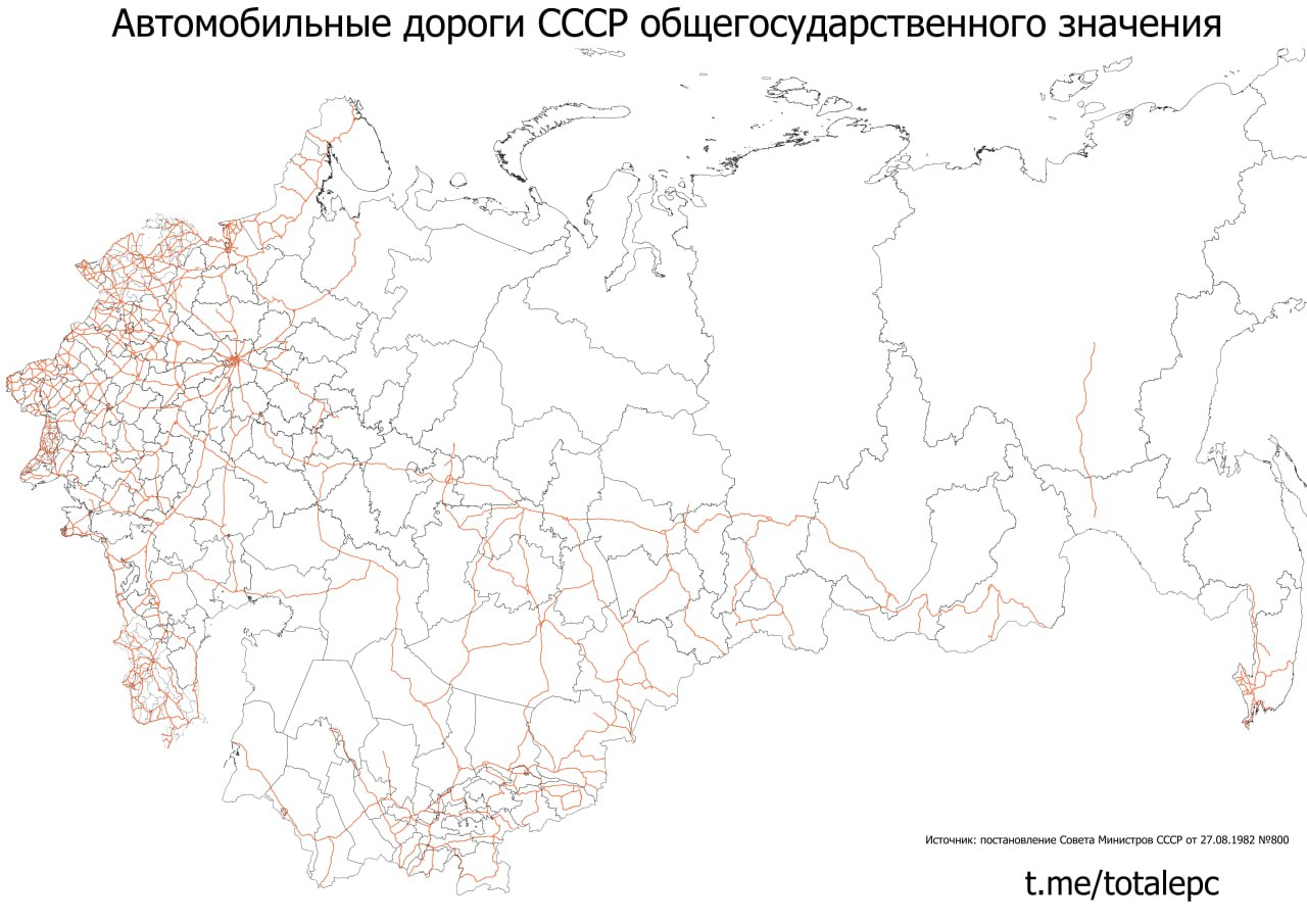 Красивая и понятная карта - плотность дорог общегосударственного значения в СССР. Из союзного бюджета всеми силами спонсировали Молдавию, Западную Украину, Прибалтику, Белоруссию, Таджикистан/Киргизию. На РСФСР, если не считать приграничных районов (Карелия и Южное Приморье) и Москву с Ленинградом, забивали огромный болт. Примерно до половины областных/краевых/республиканских центров ни одна "союзная" дорога не доходила (в Молдавии и Прибалтике доходила до самых маленьких городков). Размер болта был такой, что даже вдоль границы с Китаем, с которым готовились воевать двадцать лет, не построили ни одной дороги: между Забайкальем и Хабаровском разрыв в тысячу км.