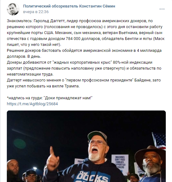 Просто любопытно, сколько тон грина отслюнявили боссы мафии коммипидору по кличке Пососёмин за этот постик. Хуегрыз коммисвинявый видимо не вкурсе, что зарплата этой старой портовой шлюхи 900000 баксов в год, у него есть яхта и буггати, лично так-то я не против мафии и даже самого Гарольда, но левое говно выставляет его как праведного борца за права профсоюза и работяг. Даггетту так-то похуй на работяг, он сам недавно сказал, что всех уволит ради бойкота. На секундочку тут недавно несколько штатов смыло, вообразите как ему похуй на всех этих людей, которые зависят от поставок. Ещё интересный фактик, профсоюзы, особенно портовые, в основном голосовали за демпартию, а значит за левачков, Даггетт сам в интервью рассказывает как вёл дела с Байденом и тот его кинул, а ещё голосуя за демов можно вечно кричать, что проверка портов на связи с мафией является дискриминацией американских итальянцев. И конечно поддержка докеров от грязноштанного скота как-то расходится с их регулярным, прогрессивным высмеиванием луддитов и воплями о роботах при калмунизме, ведь докеры против замены их на роботов как в китайских портах. Скока Костик? Или за бесплатно мафии сосёшь? Интервью Даггетта до бойкота: https://www.youtube.com/watch?v=822WNvhQHKI