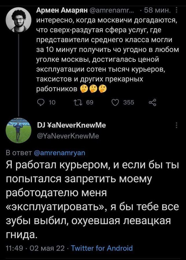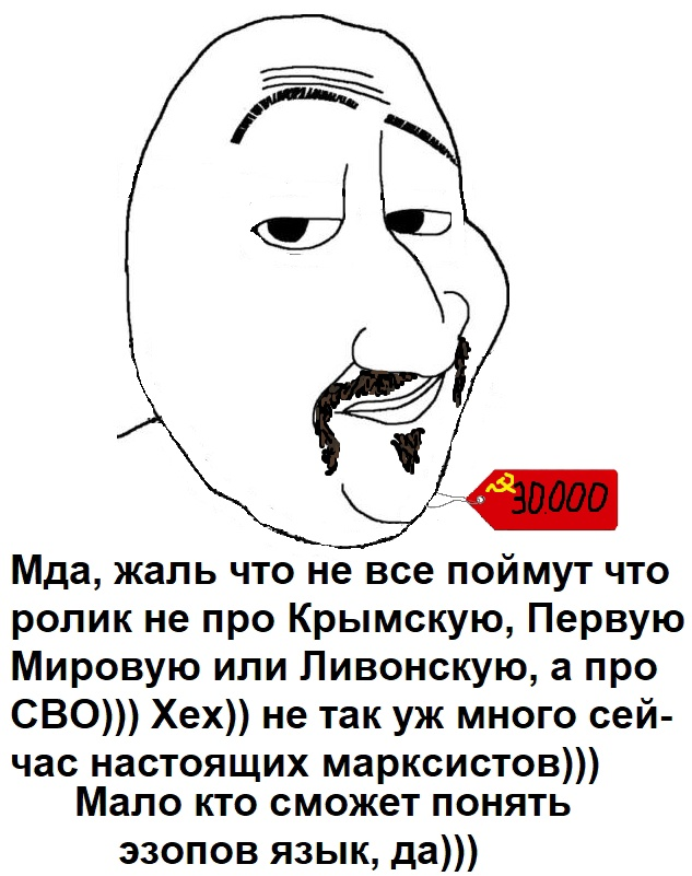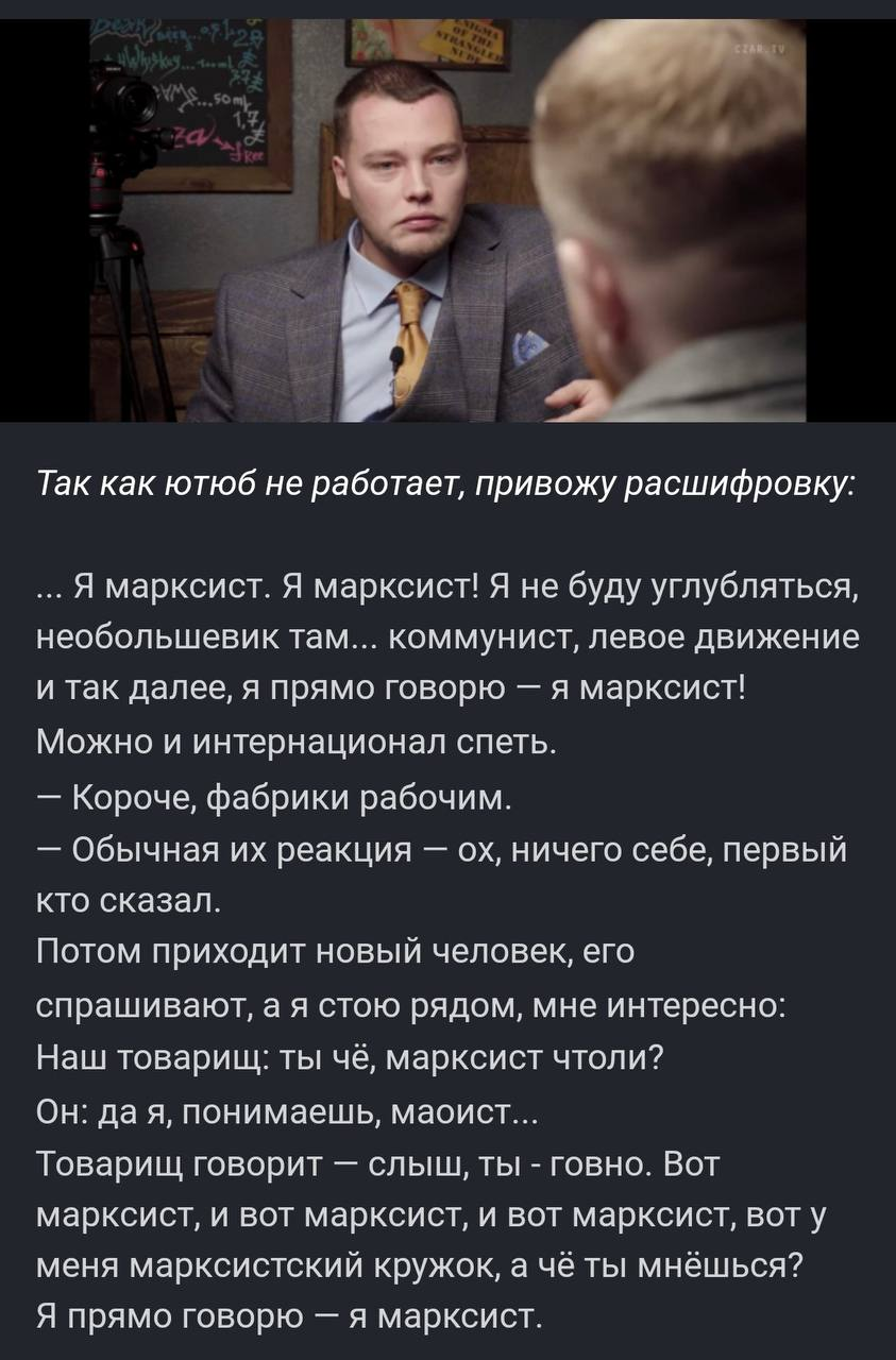 Как же на душе тепло здесь, после Бреда. Пытаешься сраться - тебя про сралина, гулаги рассказывают. Срёшься дальше - они про то, что выбор был меньше товаров. Срёшься дальше - говорят "НУ СИЧАС ЖИ ЛУЧШЕ ЧЕМ ПРИ САФКЕ ЗНАЧИТ КАМУНИЗМ ГАВНО". Ебанаты блять, так хочеться 1937 против всех этих врагов народа устроить. Рад конечно, что левая идея растёт. Как бы ещё новые люди в марксизме становились самоходными, без зависимости от ЛОМов. Я например что-то у План Б интересное посматриваю, но при этом понимаю, что они законченная охранота. Иногда тварь вербованную смотрю, особенно старые ролики - всякие социальные явления поднимает, смотрит чеоез около-коммунистическую призму. Оф карс, все эти ЛОМики проходят фильтры. Пока в плане ЛОМовства больше всего нравится Сас, понимвю что он хуево углублён в теорию, но это лучше, чем всякие Рудуа с SEMEN. Он прям панк 21-го века, в плане того, как ведёт деятельность. Даже свой видеохостинг сделал.
