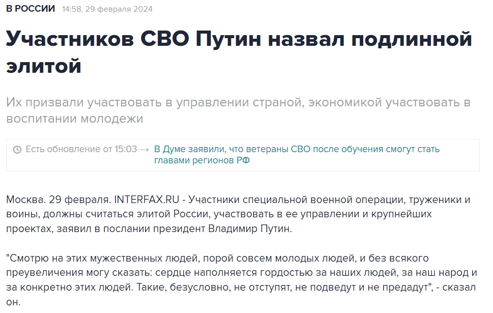 "У нас не хватает людей, у нас не хватает людей именно таких молодых. Мне разное говорят, что мы получим потерянное поколение, потому что они пойдут на войну. Если они уже не хотят идти на войну, то они уже потерянное поколение. Мы воспитали тех, кто не хочет защищать свою Родину" — сказал он.