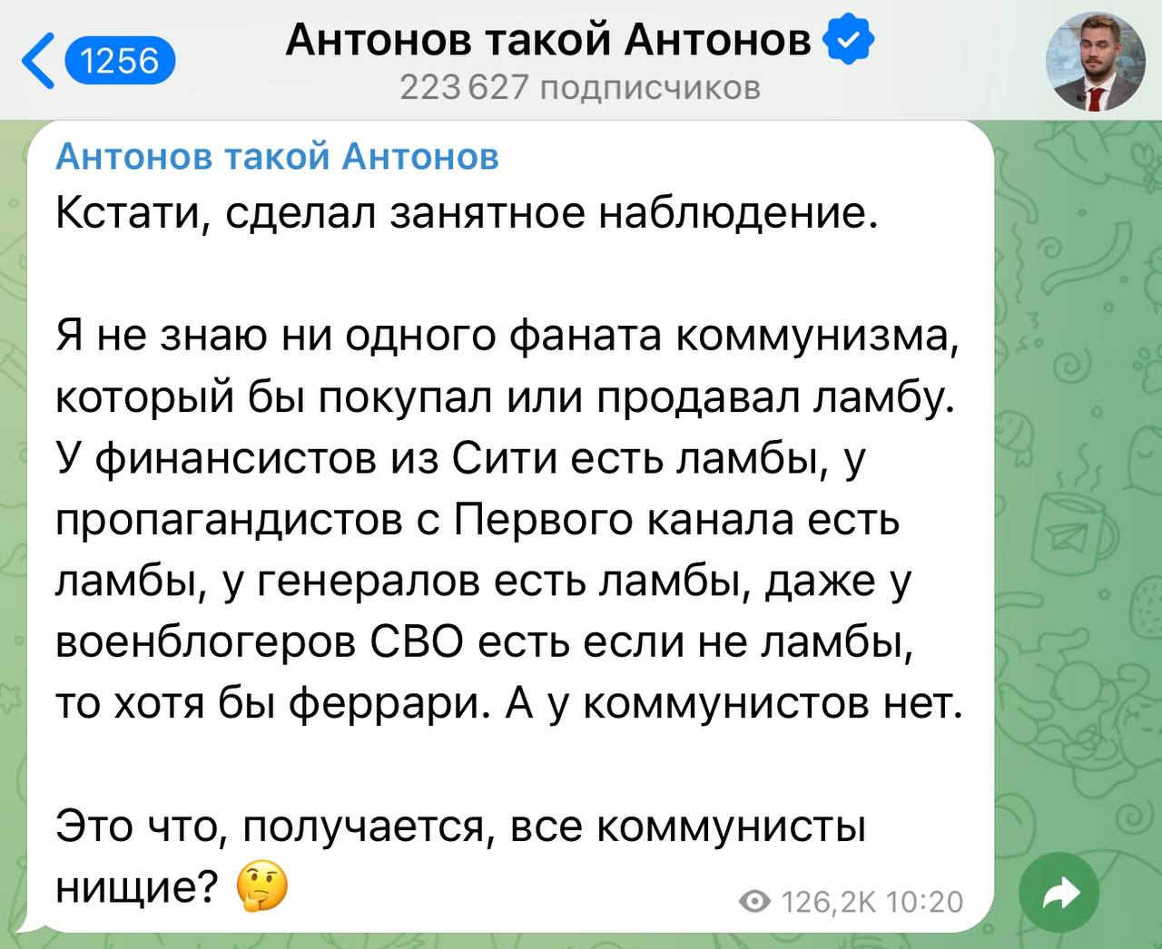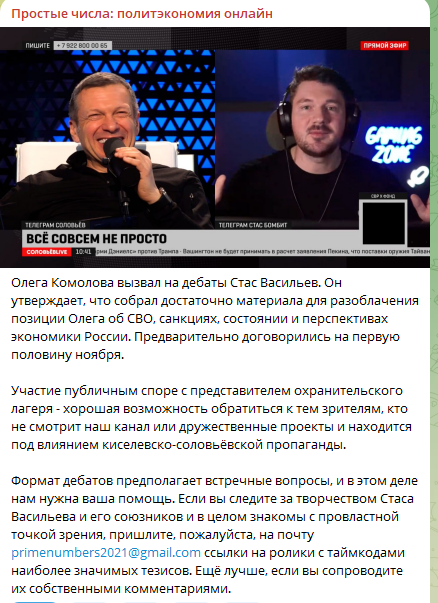 >>961021 >>961007 А смысл дебатировать с Комоловым, если он в разы тупее Сраса? Комолов у Лазерсон доказывал, что СВО устроил не Путин, а "олигархи" и в качестве доказательства привёл оценку их акций из поста СВТВ, но по этой статистике вышло так, что СВО устроил Вексельберг и Алекперов, потому что у них одних акции на тот момент подорожали, тогда как у всех остальных "олигархов" цены на акции обвалились. Теперь же даже Вексельберг и Алекперов оказались в проигрыше, потому как их акции недавно круто обвалились. Зачем тогда он их в разжигатели войны записал? А его тезис 2022 года, что после начала СВО начнётся массовая приватизация, потому как она выгодна правящему классу? Только вот ничего до сих пор не приватизировали, зато национализировали кучу заводов, но оказалось, что современный завод со всеми его станками без западного капиталиста с цепочкой поставок, ПО и менеджментом, не может выпускать продукцию. И как он тогда планирует строить социализм? Национализирует всё и будет сидеть у разбитого корыта с ничего не стоящими заводами?