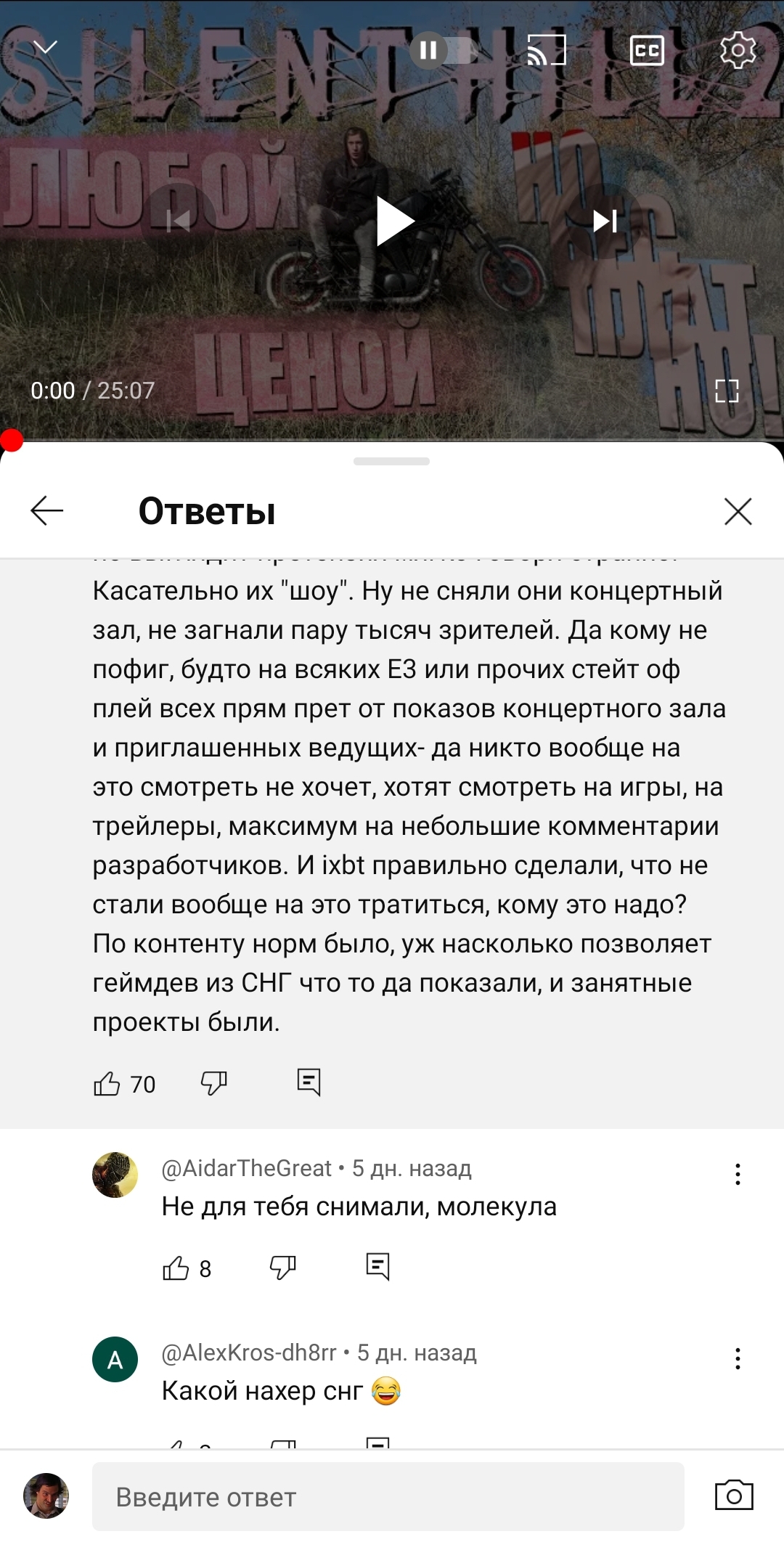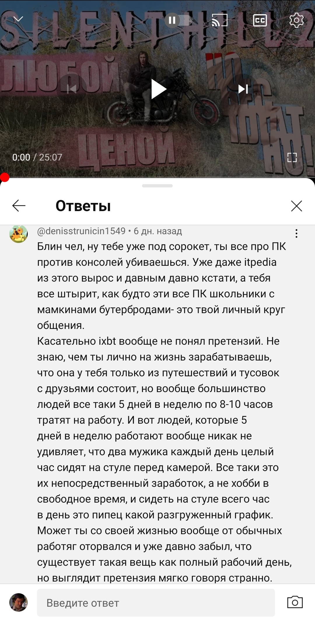 В игры не играю, потому что игры для жирных. Зачем плойку 5 купил? Чтобы на дваче доказать что могу. У меня дохуя туседжа, в SH2 ремейк к релизу поиграть не могу, но поскольку у меня игровая аудитория, то я сделаю вообще сторонний ролик реакт на обзор ixbt.