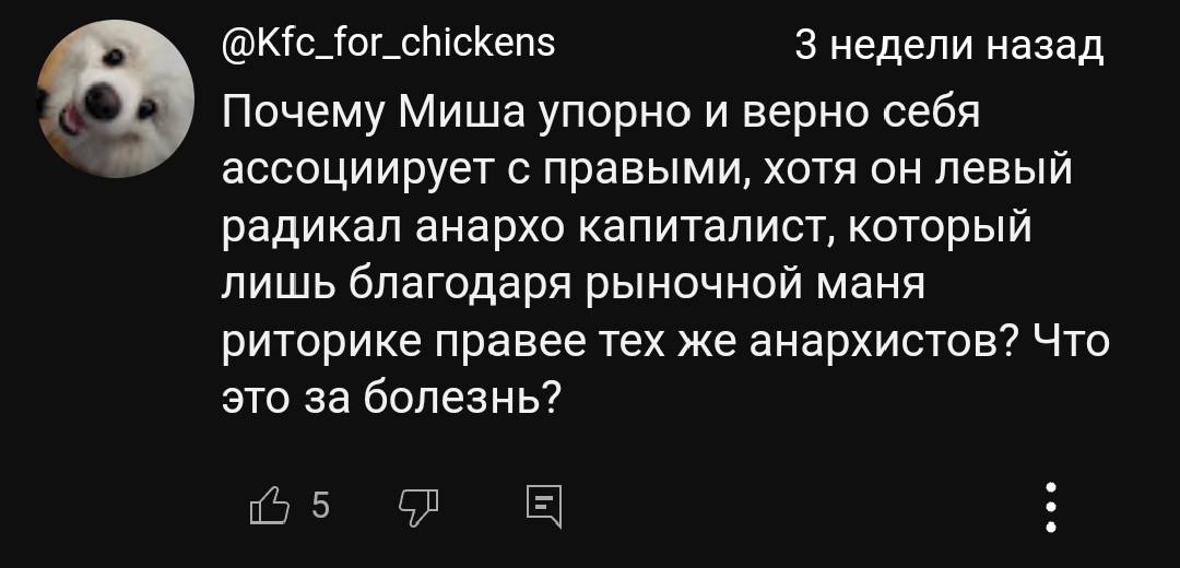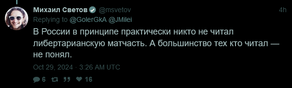 Был бы он либертарианцем, то четко бы говорил, что это мировая практика по договору со Швабом, ВЭФ для построения Новой Нормальности и прочее-прочее. А он бл реально Путина защищает словами "А в Нью-Йорке негры голодают!".