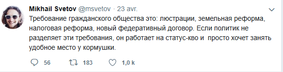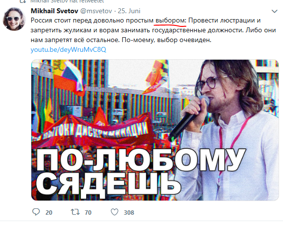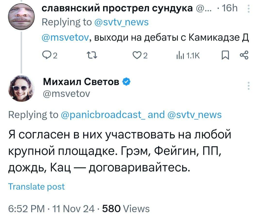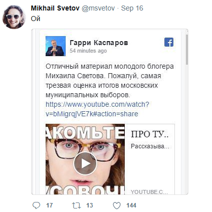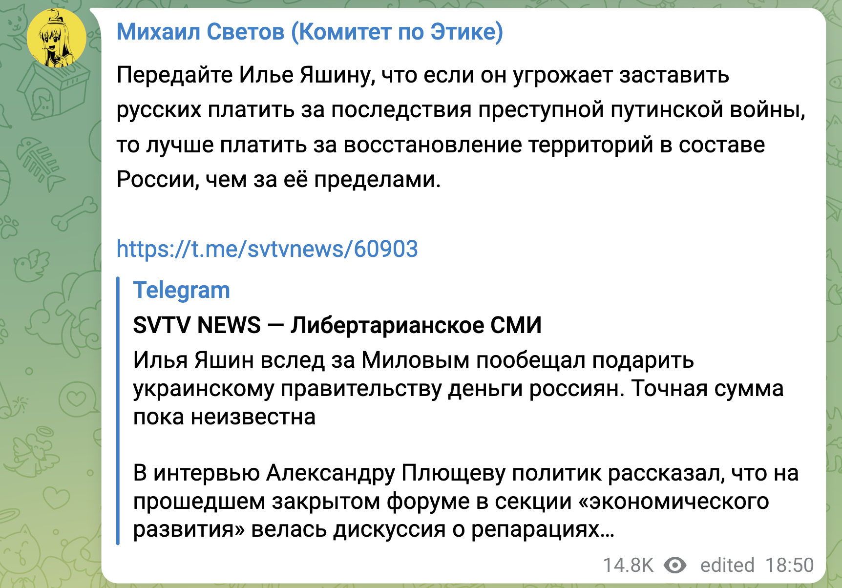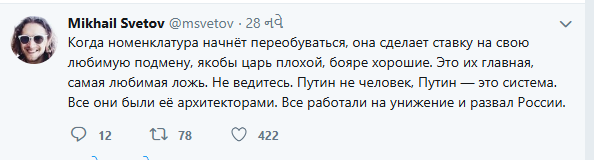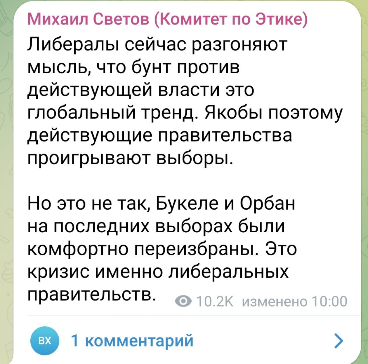 Автор этой статьи, ссылку на которую ты оставил, попался в ловушку Светова, повёлся на враньё Светова о том, что он политик. Автор статьи поверил, что пиздеть на Ютубе и срать в Твиттере - это и есть занятия политикой.