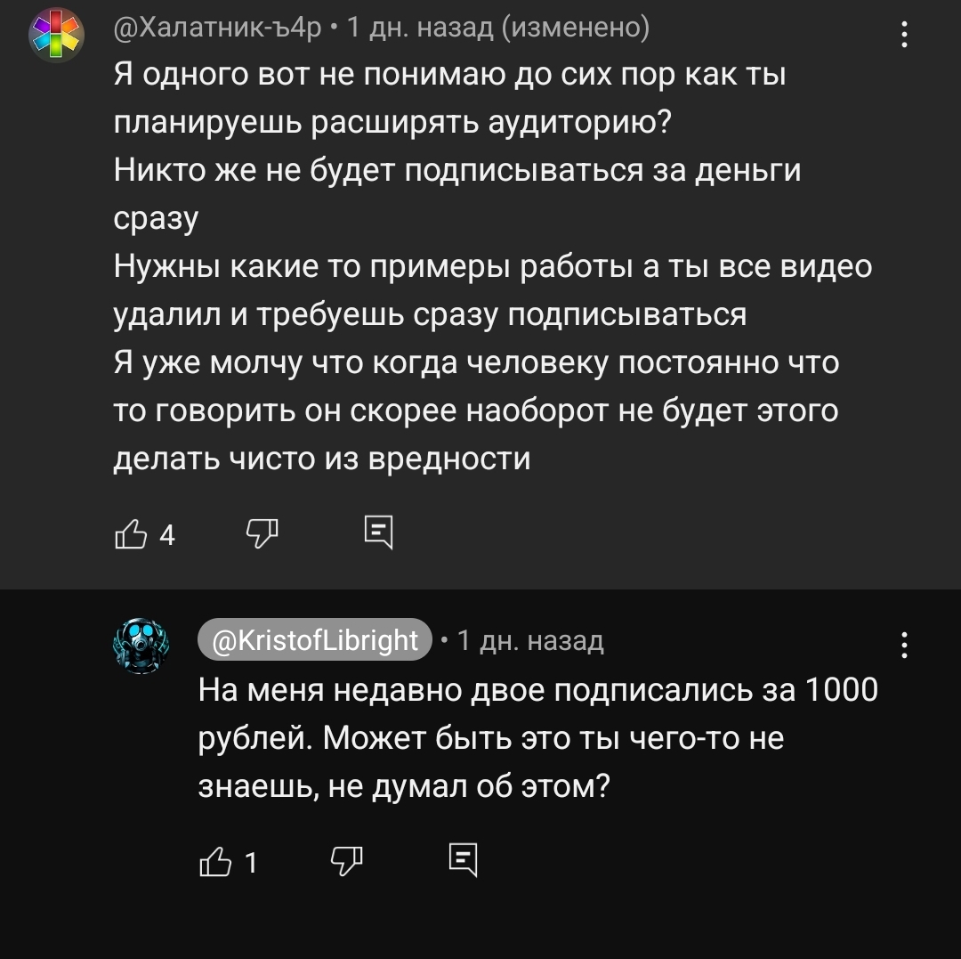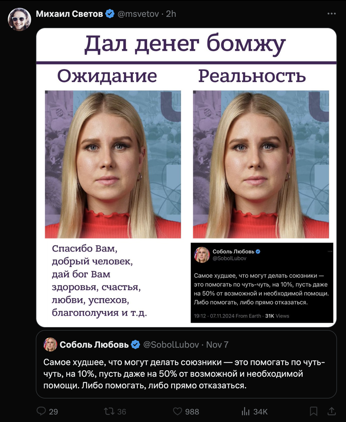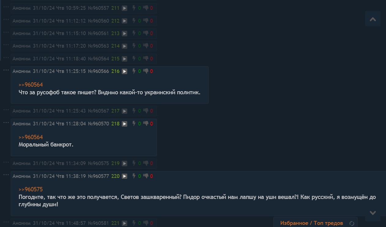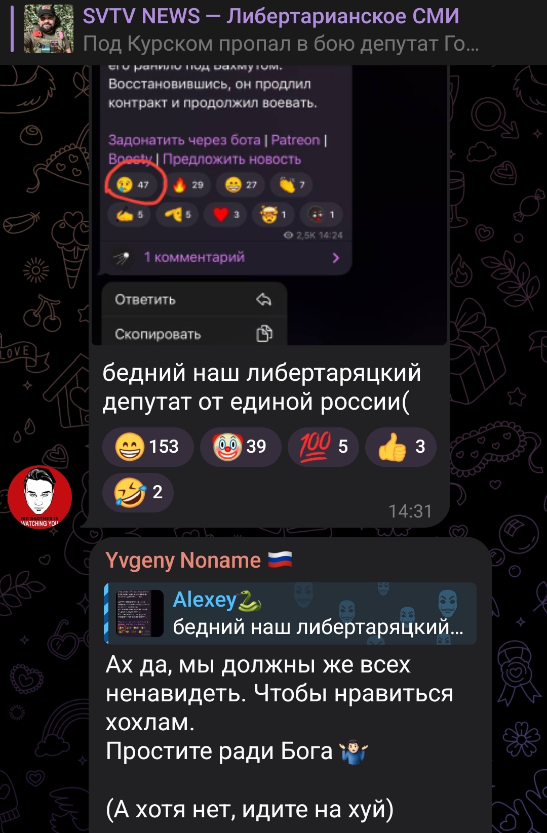 Да нет, они или просто позорятся или руками других людей в рай въезжают. Миша каждый раз хуесосит Пынявого и его действия, но стоит заикнуться про очередной обсер Волкова с ФБК (очевидно что для находящегося в эмиграции Светова важнее действия вот этих хорошихрусских, на них и акцент), как прибегает толпа дурачков и ботов (буквально блядь ботов с РРЯЯЯ ТЫ ПОДПЫНЯ ПОТОМУ ЧТО ПОСМЕЛ КРИТИКОВАТЬ ЛЮБИТЕЛЯ СЛАДКИХ ПОДАРКОВ, ПЫНЯВОГО ЧИНОВНИКА МЫНЮ И ЛОНДОНСКУЮ ШЛЮХУ РРЯЯЯ. А, ну и стоит похвалить Пынявого который оказался не тупым стариком который НУ ВОТ ВОТ РУХНУМ ЭКОНОМИКА ВСЁ ФРОНТ ПРОРВАН ИЗОЛЯЦИЯ ЛЕЖИТ МЕРТВЫЙ В ХОЛОДИЛЬНИКЕ, а вполне доказал что он та еще заноза в жопе - так такое же ряя. То есть каждый раз перед критикой проходимцев надо как в христианском храме перед литургией говорить "отречение от дьявола"? - "Осуждаешь ли ты Пыню и его преступления прежде чем нести хулу на святое ФБК?" - "Осуждаю"