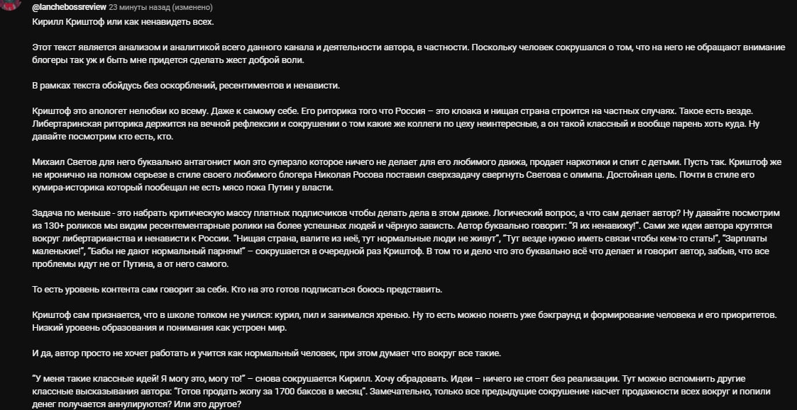2. Вместо реальной ловли Светова за руку видел постоянное "Рряяяяя!!!!! Светов плохо сказал про хрюкаину!!!((((( нельзя говорить плохое про усраину((((((( усраина переможе, рашка ето орки(((( скажите светову чтобы перестал писать неприятное про швятых хохлов((((((((". Постоянное нытьё свиней и подсвинков. А могли бы реально ловить Светова на противоречиях, но это слишком сложно для зрителей Убермаргинала. Канал - говно. Нужно быть реально безмозглым подсвинком или хохлом, чтобы читать его дольше 15 минут.