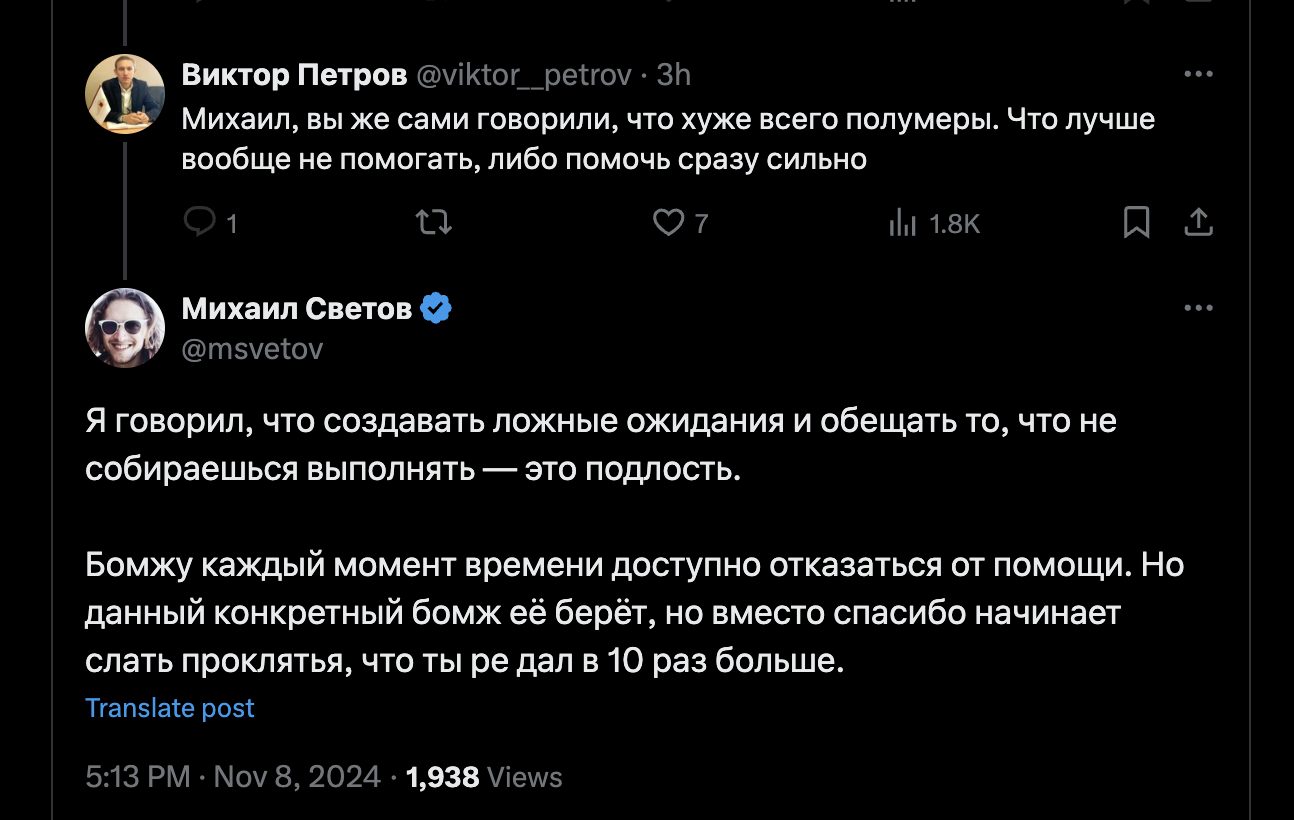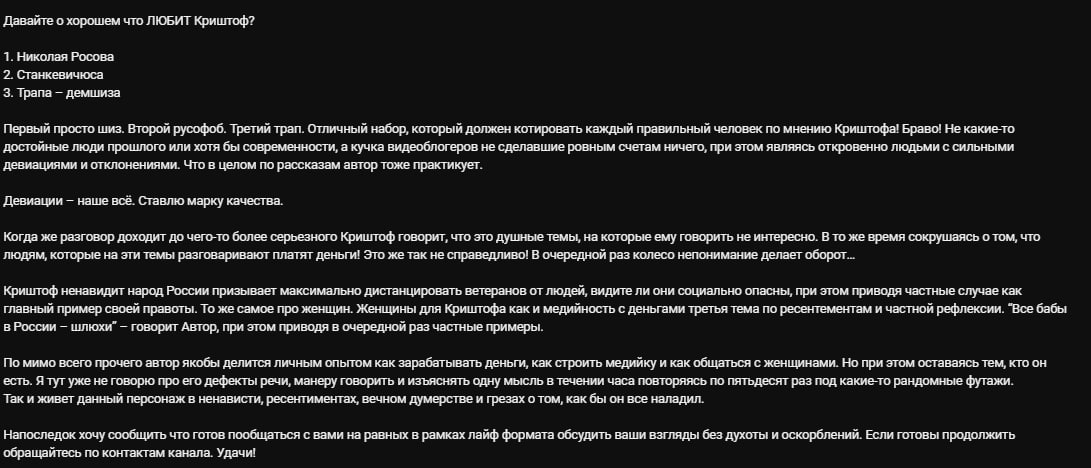 А если без эмоций, то где Миша-то КОНТОРСКИЙ? Ну ладно, родители у него богатые, мажор, хуйню любит нести и делать. Но в целом-то? Ну пострадал в Рашке херней, позанимался среди детей "политикой, пособирал клубасики. Уехал за бугор, внезапно увидел что вся ру-оппозиция это хуесосы и пидорасы. Или прямо причастны к ебанутым двуличным санкциям (поставки лекарств забаним, а счета олигархов или прокачку ресурсов - нет), или подставляют людей (как ФБК с тем ребенком) или просто мутные личности - от вчерашних путинских силовиков и чиновников до ((Певчих)). Ну и сама по себе тусовка из душных борющихся за гранты уебков, готовых сожрать друг друга, подставлять сограждан, нести любой людоедский бред и так далее. Идет третий год СВО, уже скоро четвертый пойдет, что сделали сотни тысяч этих манялиберах-релокантов? Сотни лидеров мнений, политиков вечно молодых кроме тонн срачей в твиттере и мольбы Госдепу и ЦРУ на выделение побольше грантов? Обустроили себе хорошую жизнь в Лондоне/Вильнюсе на деньги европейских налогоплательщиков, а дальше что? Они может помогли уехавшим из РФ русским? Стали серьезной политсилой к которой прислушиваются? Их деятельность приближает крах Пыни?