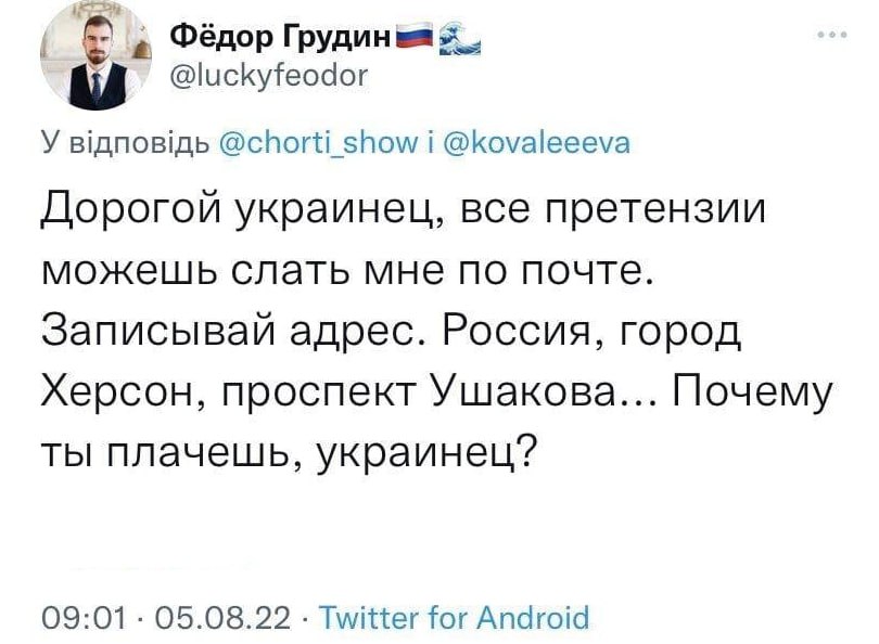 >>960243 >>960260 Прикол в том, что люди массово стали догадываться, что он на кого-то работает, но пришли к абсолютно идиотской мысли, что он работает на кремль. В неокрепших умах до сих пор господствует мысль, что что кроме как на рф в этом мире работать не на кого. Поздняков сбежал из России как и многие подхохловики типа Дудя. Это ципсошник, который вообще не скрывается.