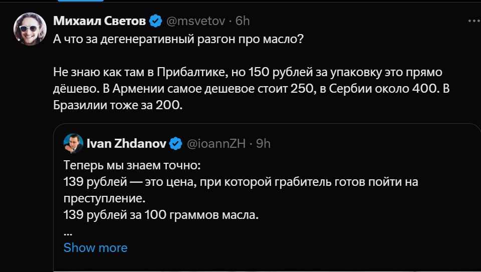 >>962656 >>962660 >>962826 >>962876 >>962837 Не хочу оправдывать михуила, но тут он близок к истине. Вот среднерыночная цена на масло 82%, а вот самое дешевое, которое покупаю я в Магните у дома.