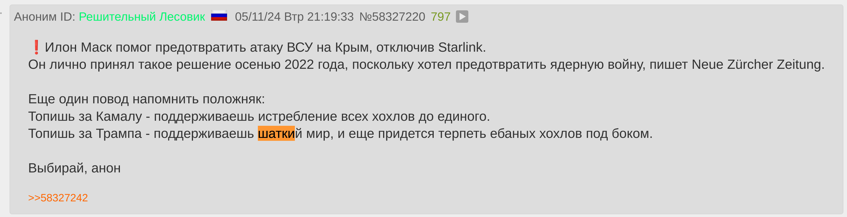 >>960663 какой тебе адекватныцй ответ нужен,лахтеныш?Не замечать как конкретные антиукраинские тейки светова,так и общий антиукраинский вайб может не замечать только такой же ватник как и светов.Внутреннеполитическая критика запада от человека ,называющего себя руске политиком,донаты на десятки лямом от неизвестных личностей,реклама "волги 149.200 "с донатом 100к,снятие ответственности с наших мальчиков,котоыре в99.9 процентов случаев добровольно подписали контракт от ЛИБЕРТАРИАНЦА,годами втиравшего про ценность волюнтаризма,заполонившая комменты лахата и зетники,которые даже не шифруются,ярая ненависть к единственносй оппозиционной организации из трех букв и не менее ярая неприязнь к другой оппозиционой организации из трех букв с певчих во главе за внимание! РАДИКАЛИЗМ и все это если не однозначно отвечает на вопрос о конторскости светова,то как минимум должно поднимать серьезные вопросы от нафани,котоыре только недавно познакомился с его творчеством,крым ,кстати чей?