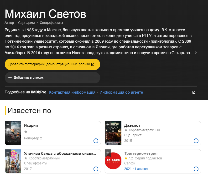 В 2016 году окончил Новозеландскую киноакадемию. По сценарию Светова вышел короткометражный фильм «Jackpot» в Новой Зеландии, который занял первое место на государственном конкурсе сценариев и получил спонсирование на экранизацию. Пруфов, конечно, не будет
