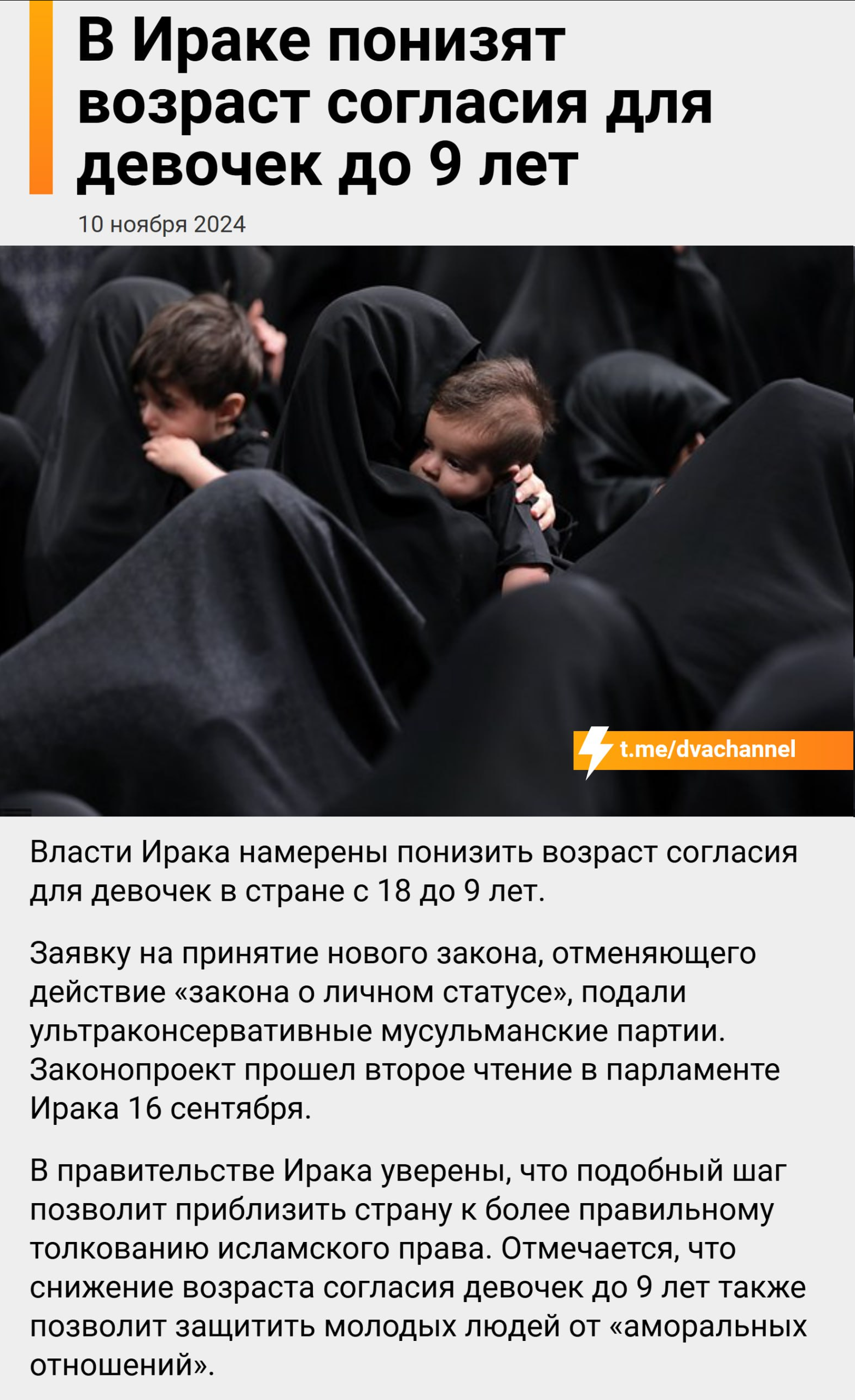 «Ультраконсервативные мусульманские партии подали заявку на принятие нового закона, который сократит существующий возраст согласия вдвое по сравнению с существующим пределом в 18 лет»