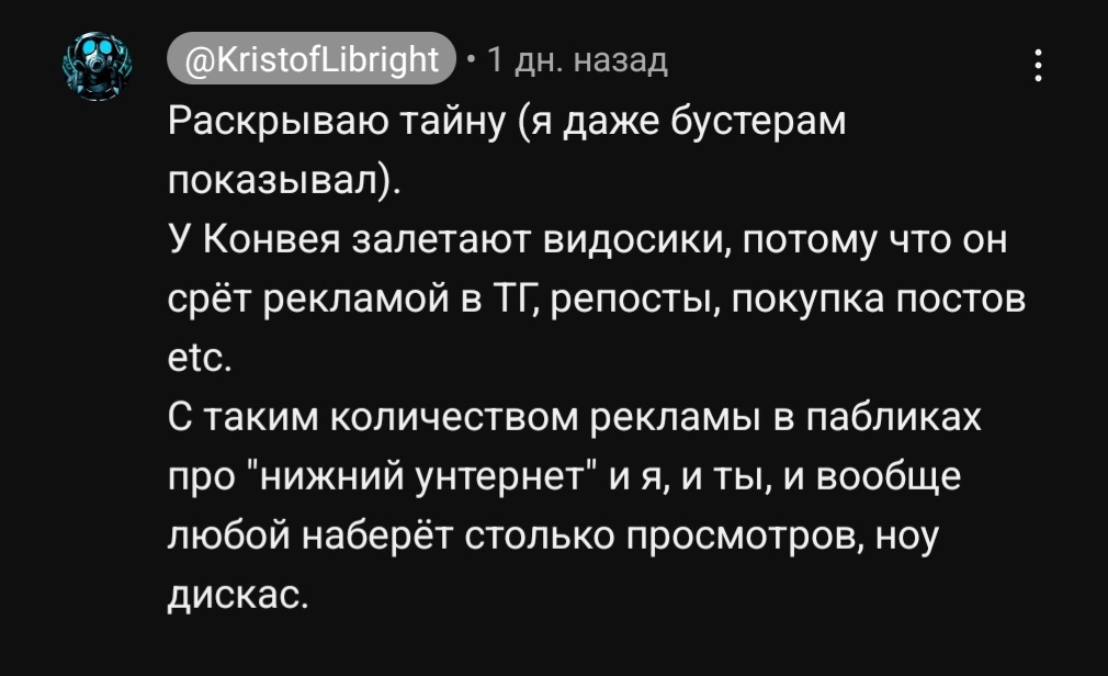 >>963995 Шиштофф, ты понимаешь что пгавых базавочиков после 2016 года ютуб всегда искусственно пессимизирует? конечно нет в 2016 ты начал 5 класс, такие вещи чисто физически помнить не можешь Твой кумир до того, как начал насасывать левочку hbomberguy 2 года не мог набрать зрителей на американском ютубе, делая свой политический контент.