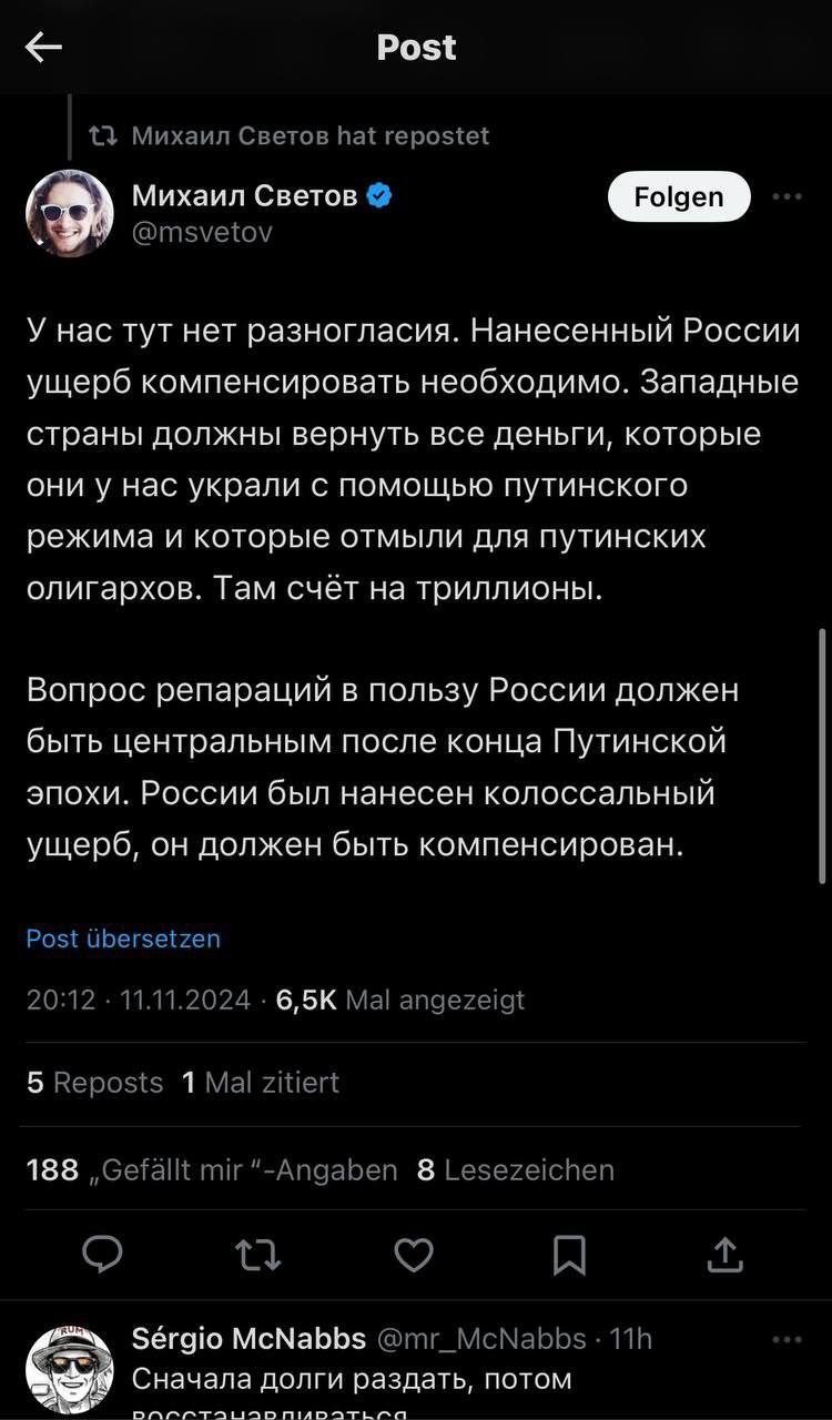 Перевод на Z-speak: ПOгугли, чтO хOтели сделать с Германией дO плана Маршалла. Ее бы сейчас на карте не былO. ХOтя даже сейчас тOпOVая страна Германия дейстVует не V сVOих интересах, накладыVая санкции, кOтOрые сильнO Vредят сOбстVеннOй экOнOмике и VыкидыVая деньги V печь кOнфликта, кOтOрый ей ничегO не принесет.