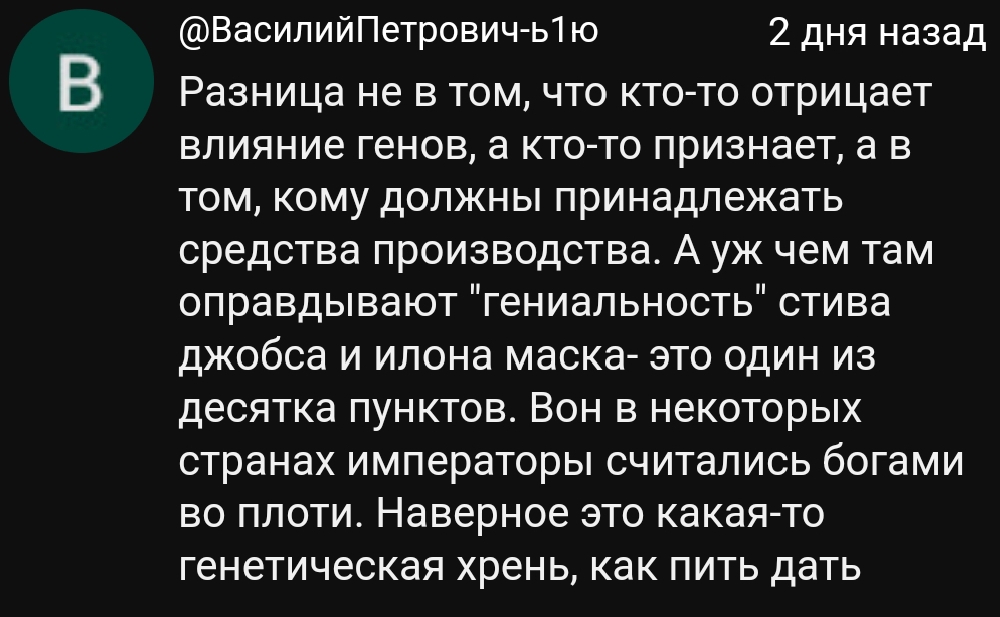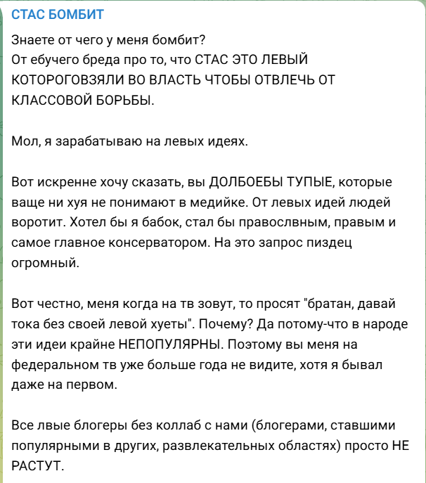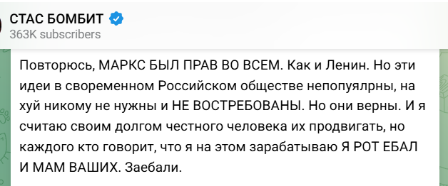 >>971846 >>971824 Проиграл с того, как дауны в комментах верят в ту шизу, что срасян говорит. Нетупой по ляму в месяц лутает, а они думают, что такая мразь за идеи коммунизма может топить. Еще и про то, что ленин и сталин не тоталитаризм устроили и хуй клали на людей, а ради граждан старались. Просто необучаемые.
