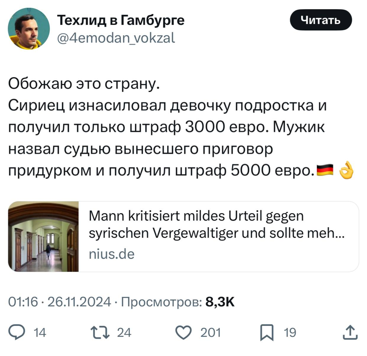 Я вот подумал: коли так, то полезно, чтобы первым актом Трампа стал бы закон о запрете ЛГБТ повесточки и участия трансгендеров в женских соревнованиях, а также запрете смены пола до совершеннолетия в принципе. А то, понимаешь, сигареты и бутылочку пива до 21 года купить нельзя, потому что дурак еще, а яйца отрезать ума хватает. Я думаю, это серьезно его рейтинг поднимает. Просто в прошлый его срок эта проблема так остро не стояла.