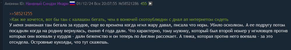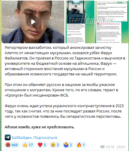Все больше видео из Сирии, где идут открытые обращения к джихаду на русском языке, направленные, в первую очередь, на тех, кто этот язык так или иначе понимает: жителей Средней Азии, а именно граждан постсоветских республик. Тех самых, что массово завозят в Россию под видом трудовых мигрантов. То есть среди уже привычных нам курьеров/таксистов/строителей вполне может оказаться скрытый боевик, успевший даже поучаствовать в боях на Ближнем Востоке.