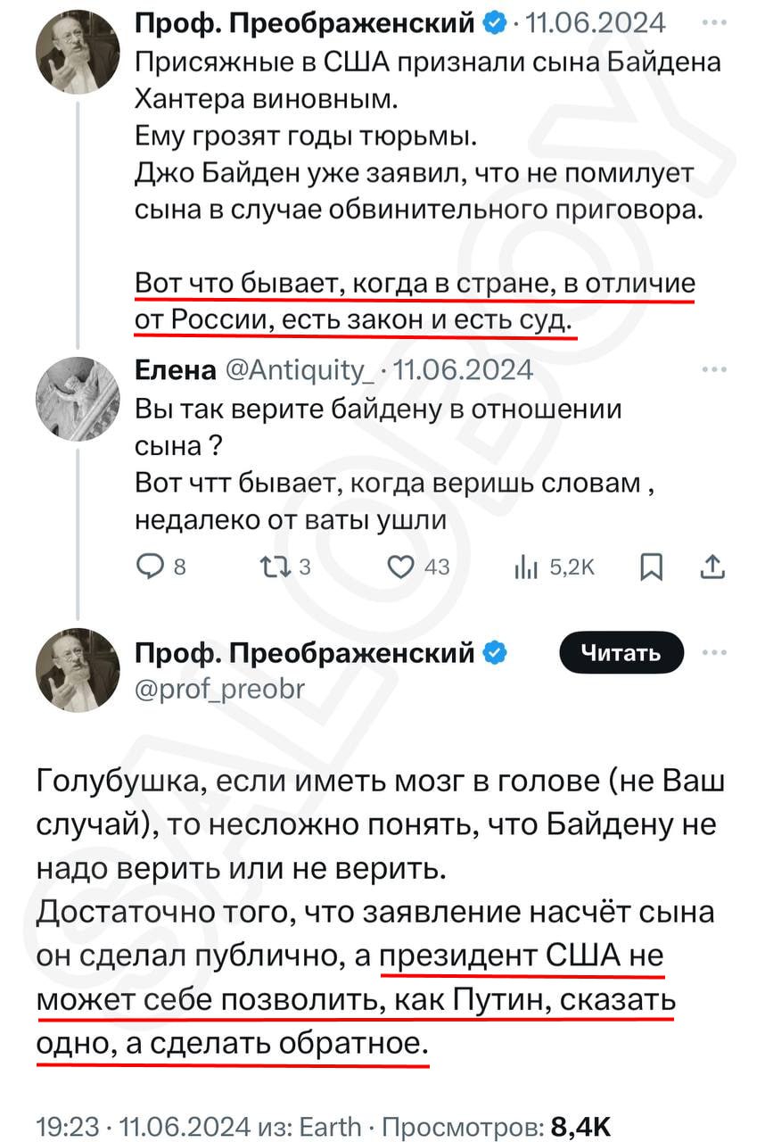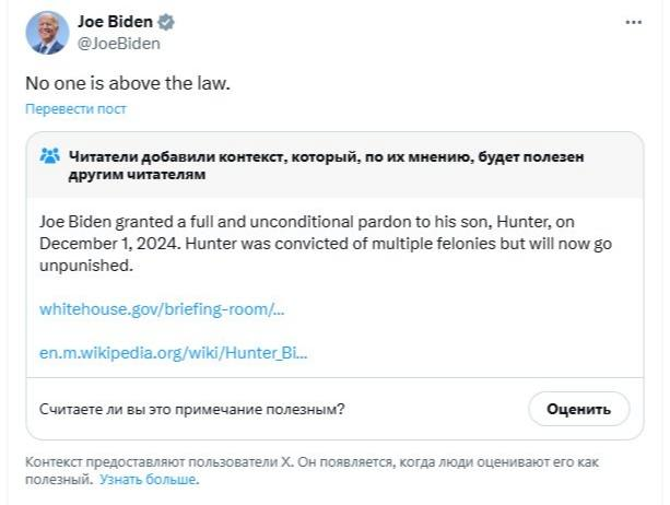 Президент США Джозеф Байден помиловал своего сына Хантера, который мог загреметь в тюрьму как минимум на 15 лет. Президентское дитятко на шестом десятке лет признано виновным в неуплате налогов и хранении оружия в период употребления наркотиков. Коррупционное дело вокруг работавшей на Украине компании Burisma Holdings, в которой Байден-младший был вице-президентом, так и не расследовано. Украинский президент Пётр Порошенко уволил занимавшегося им генпрокурора Виктора Шокина по требованию Байдена-старшего. Замяли и историю с педофильскими фото в компе Хантера. Он предположил, что фото забросили русские - и полиция поверила.