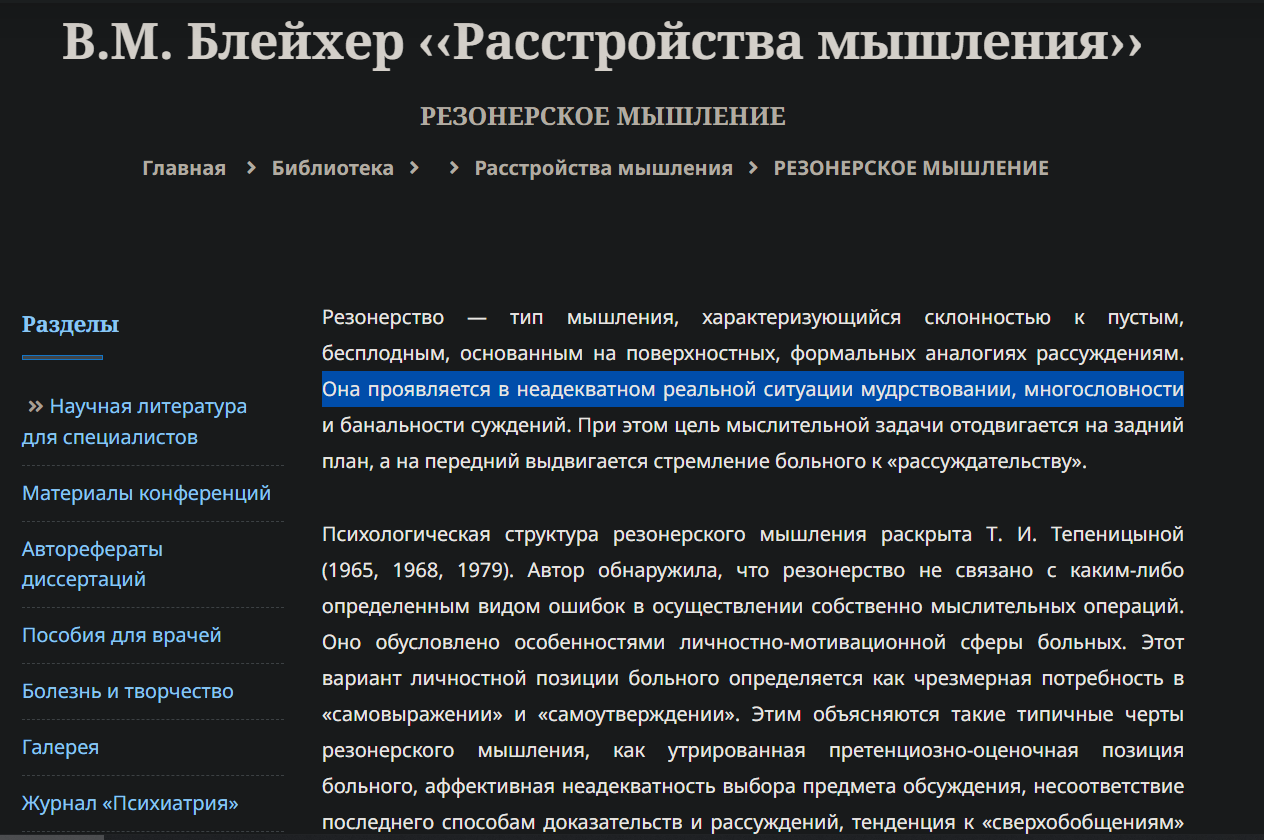Answer Симптомы, которые вы описали, могут указывать на наличие психического расстройства, особенно связанных с бредом и нарушением мышления. Рассмотрим каждый из них подробнее: Основные симптомы Резонерство: Это может проявляться в чрезмерной логичности и сложных рассуждениях, которые не всегда соответствуют реальности. Люди с бредовыми идеями могут создавать сложные, но нелогичные аргументы для обоснования своих убеждений14. Частое использование неологизмов: Это может свидетельствовать о нарушении мышления, когда человек использует новые слова или создает собственные термины, которые могут быть непонятны окружающим. Это часто наблюдается при шизофрении и других психических расстройствах35. Отсутствие логического мышления: Люди с бредовыми расстройствами могут не осознавать иррациональность своих убеждений и не способны критически оценивать свои мысли, что приводит к нелогичным выводам14. Навязчивые бредовые идеи: Это стойкие ложные убеждения, которые человек считает реальными, несмотря на доказательства их ложности. Такие идеи могут быть разнообразными и часто не поддаются опровержению даже при наличии явных фактов23. Ограниченность тем разговора: Если разговор сводится к одним и тем же темам, это может указывать на фиксированные идеи или навязчивые мысли, что также характерно для бредовых расстройств45. Изменения интонации при разговоре: Интонационные колебания могут отражать эмоциональные нарушения или нестабильность психического состояния, что также может быть связано с психическими расстройствами12. Заключение Эти симптомы могут указывать на серьезные психические расстройства, такие как бредовое расстройство или шизофрения. Рекомендуется обратиться к специалисту для диагностики и возможного лечения, так как такие состояния требуют профессиональной помощи для улучшения качества жизни пациента и его взаимодействия с окружающими.