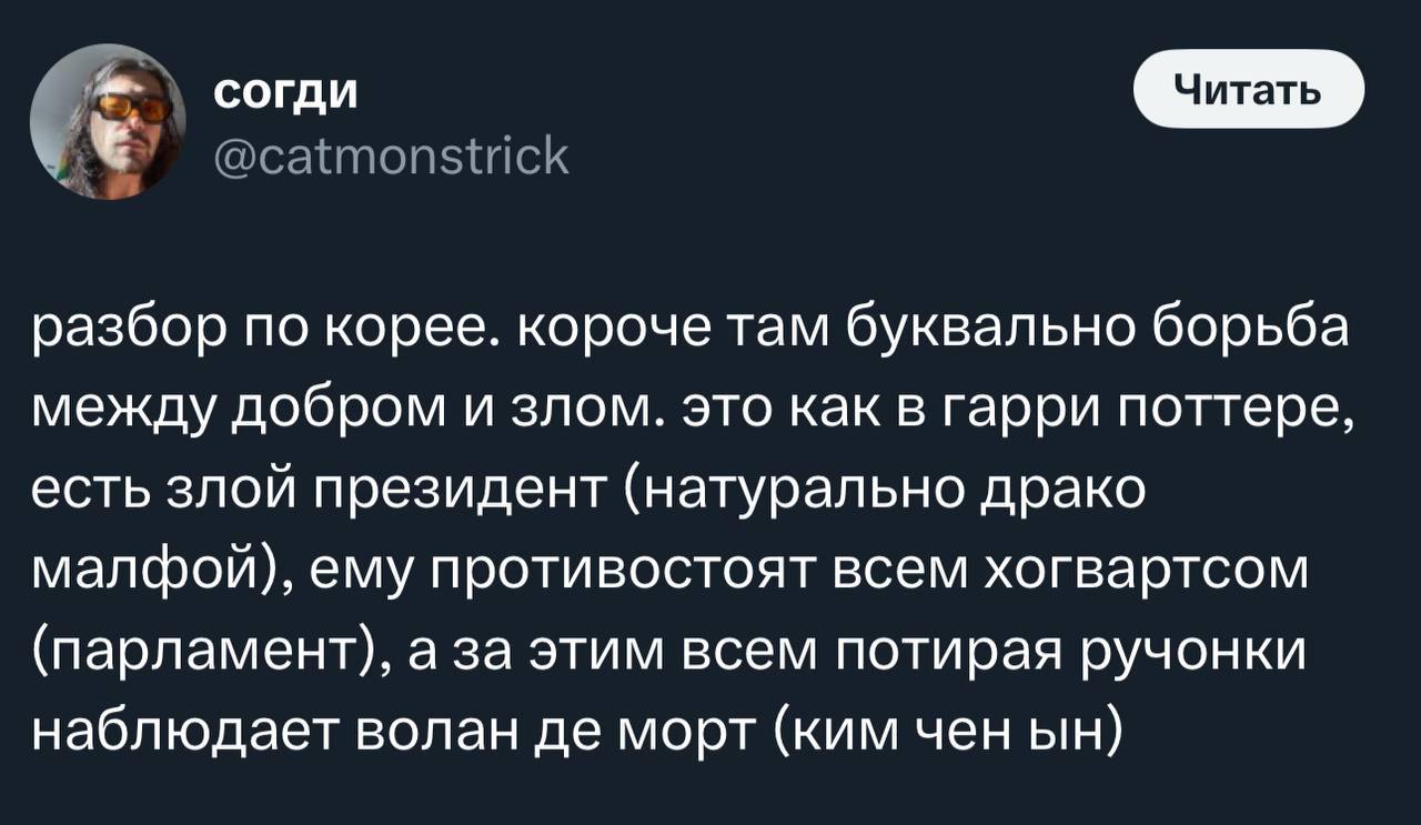 Президента Южной Кореи заподозрили в мятеже К парламенту страны направили армейский спецназ, который должен был блокировать проход в него депутатов, но Национальное собрание все же смогло собраться и проголосовало за отмену военного положения. На заседании присутствовали 190 из 300 депутатов, они единогласно поддержали требование к президенту отозвать свое решение. Согласно Конституции Республики Корея президент обязан отменить военное положение в стране после того, как парламент большинством голосов проголосовал против его введения. Спустя более трех часов после голосования президент пообещал отменить военное положение. Вскоре после этого решение об отмене оформили официально на заседании правительства. Командование, созданное для обеспечения режима военного положения, распустили, отправленных к парламенту военных также отозвали. Южнокорейская оппозиция заявила, что выдвинет обвинения в госперевороте против президента, министра обороны Ким Ён Хёна, министра внутренних дел и безопасности Ли Сан Мина, а также других ключевых участников событий из среды военных и полиции. Sic semper tyrannis