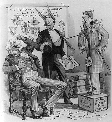 Карикатура американского адвоката, занимающего высокий пост, Уорда Макаллистера (1855-1908), указывающая дяде Сэму на «английского сноба XIX века» и говорящая, как он должен подражать ему, иначе «ты не будешь джентльменом». Дядя Сэм показан смеющимся от души.