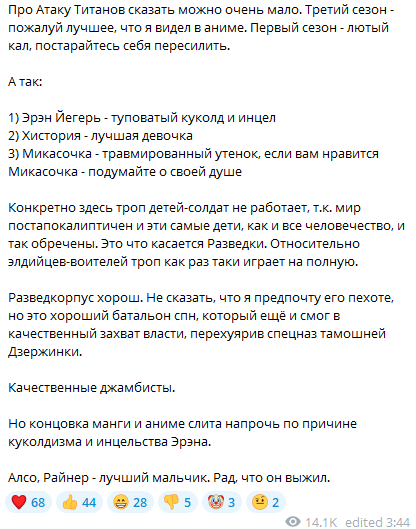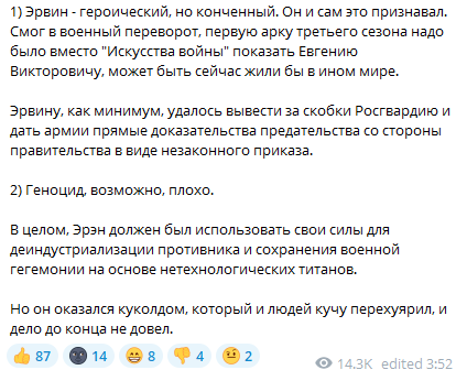 — Андрей в курсе недавнего щитшторма вокруг Саши Пелевина и даже сослался на комментарий Дегтерёвой о «Покрове-17». При этом Андрей не раскопал, что у Дегтерёвой к Саше личные счёты и всего несколько лет назад она сама хвалила это же произведение. Поверхностный лох, получается.