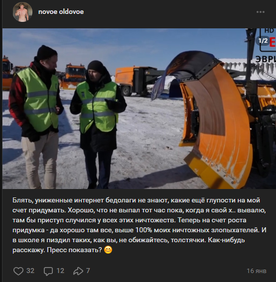 >>977769 Я помню, как Борямба смеялся, что наш немолодой лидер показывает голый торс с обвисшими сиськами. Теперь же сам немолодой Борямба каждые пять минут показывает голый торс с обвисшими сиськами и вспоминает бурноволосатого. Один в рваной одежде катается на мотоцикле по помойкам и хвастается консолью. Другой катается на какой угодно технике, вплоть до военных самолётов и живёт как император. Мне кажется, что здесь дело не в чувстве справедливости, а в глубокой зависти истероидного нарцисса к тому, кто во всём лучше него.