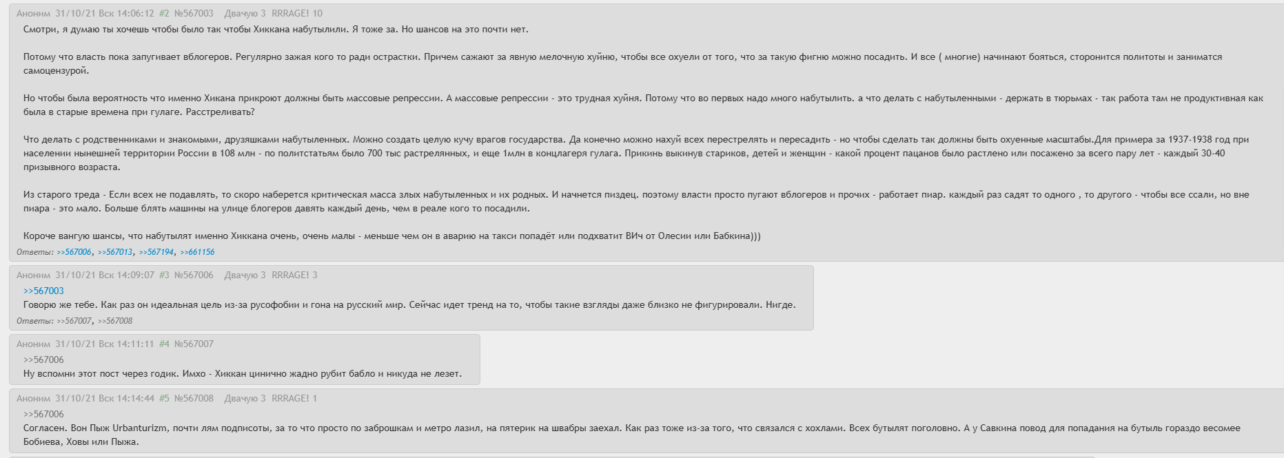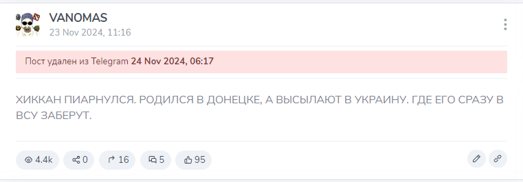 Почему Хиккана вообще депортировали? Он никому плохого не сделал, законы не нарушал! Это подстава подстав! Он ни над кем не издевался, а наоборот всем помогал. Огров кормил, поил, снабжал деньгами, пиарил, даже тараканов им вывел! Кругом одна неблагодарность и несправедливость! Злые вы! Надо помочь Алексею финансово, его бусти в телеграмм группе: ГРУ ХИККАНА. Работаем братья!