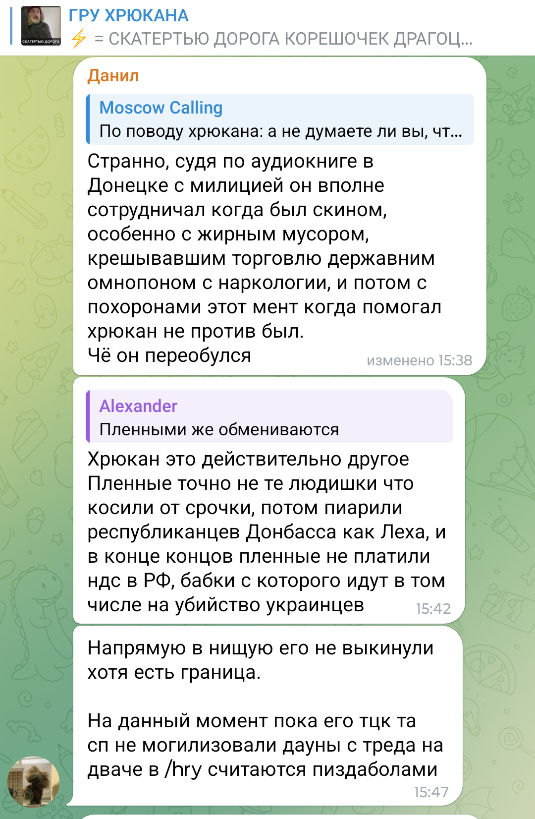 Если пиявыча таки вернут на родину, то я не думаю, что он сможет избежать пиздеца и видимо его действительно отправят помирать в окопы. У хрюкана точно были терки с каким-то хохлоблогером, лет 5 назад. Помню это было до закрытия Ваномас Арены. Мб это и был как раз Ганул, хз я не помню. Или с Вилатом что ли хз, но точно не сыном таджика Вольновым.