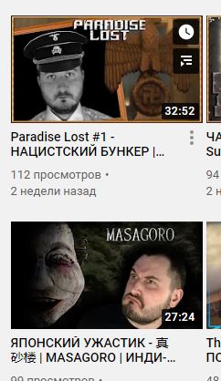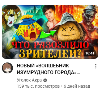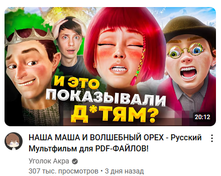 >>1058770 Да, на слово "дети" Ютуб может среагировать. Загадочные алгоритмы Ютуба весьма трепетно сейчас относится к превью, и раз этот ролик тебе высветился(мне он, кстати, тоже попался. Хотя я не гуглил ни отечественных мультиков, ни канал Акра) - значит тип делает все правильно в продвижении роликов. В принципе, много слов нежелательно произносить в видео: наркотики, изнасилование, расчленение. Даже слово "убийство" и "смерть" некоторыми блогерами обходятся. А ещё есть ряд политических каналов, которые запикивают страну "Украина".