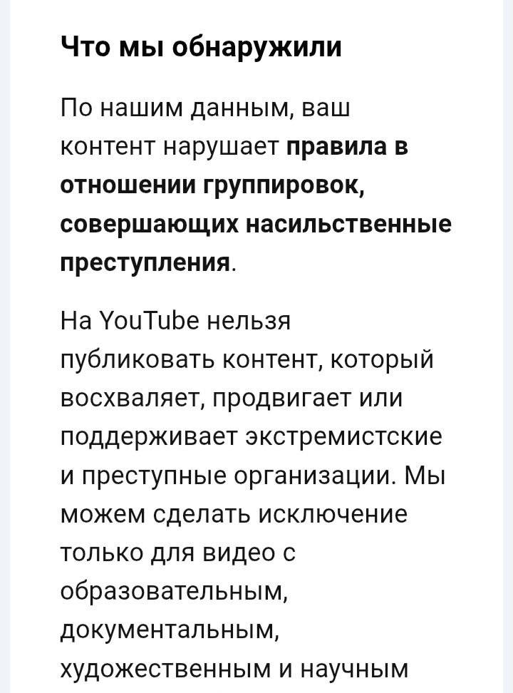 Но сегодня, 26 октября, YouTube повторно (https://t.me/ad_factum/1912) снесли канал, теперь сославшись на «нарушение правил о контенте, связанном с насильственными и экстремистскими организациями».