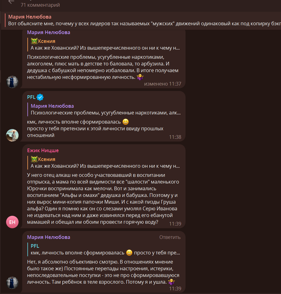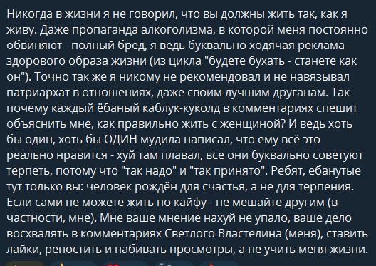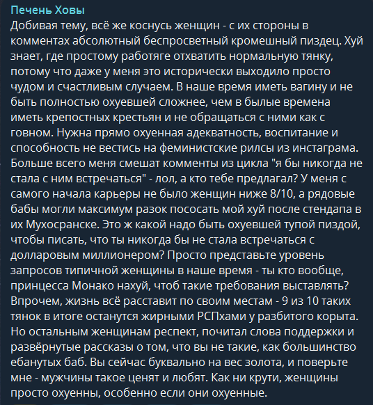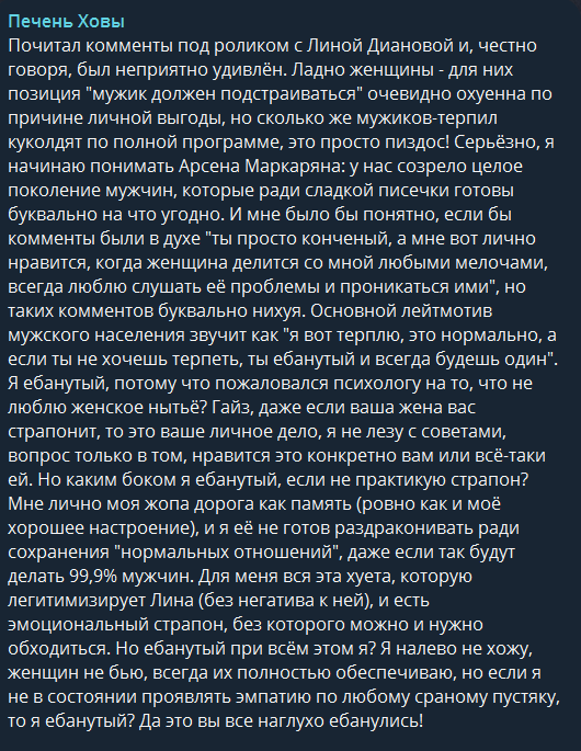 "Добивая тему, всё же коснусь женщин - с их стороны в комментах абсолютный беспросветный кромешный пиздец. Хуй знает, где простому работяге отхватить нормальную тянку, потому что даже у МЕНЯ это исторически выходило просто чудом и счастливым случаем."