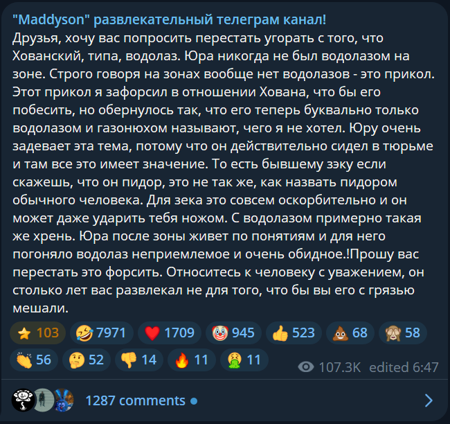 Хован думаю так же. После отсидки в Сербии он как-то мэду задвинул этот рофл про водолазов. Как я понял в личном общении. И потом во время общения уже с нейрохованским мэд об этом вспомнил и всячески намекал нейроховану что тот на зоне выдыхал газы зэков. Ну и чат мэда подхватил шутку и весь аукус ей бомбил. Ну потом пошли нарезки и мем вышел за пределы чата Ильи. И чем больше хован копротивлялся, тем больше он распалял людей на творчество. Вот и весь сказ о водолазе.
