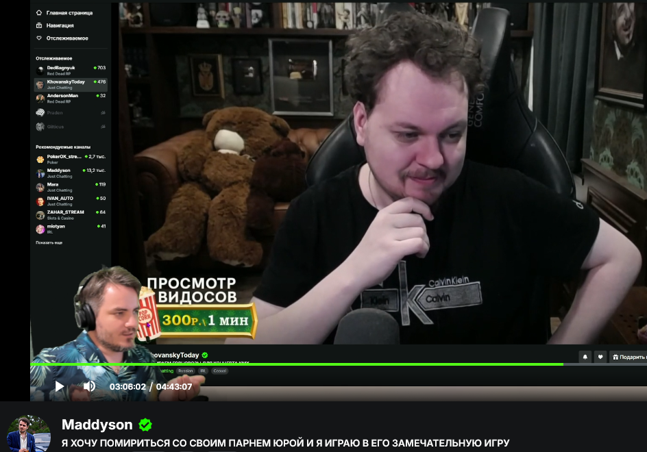 Медленно сходит с ума в одиночестве. Устраивает анальную цензуру на стримах. В прямом эфире жрёт, спит, разводит додиков на деньги, рекламирует наркотики и разлагается на камеру.