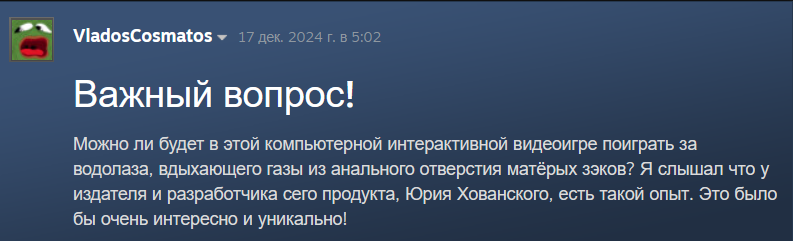 Юлик тупой, тупой пиздец. Просто потому что было интересно сел и сделал игру, делает вторую. Гениальный Водолаз 138 атмосфер в голове айкью, пять лет дрочит пиксельную залупу с толпой разработчиков. Ой ой, не взлетело почему-то. Гениальный краснодипломный экономист решил, что игра выедет на популярности водолазной и ни копейки в рекламу не вложил, хрюк пук - продажи хуевые, всем спасибо, нихуя не заработали.