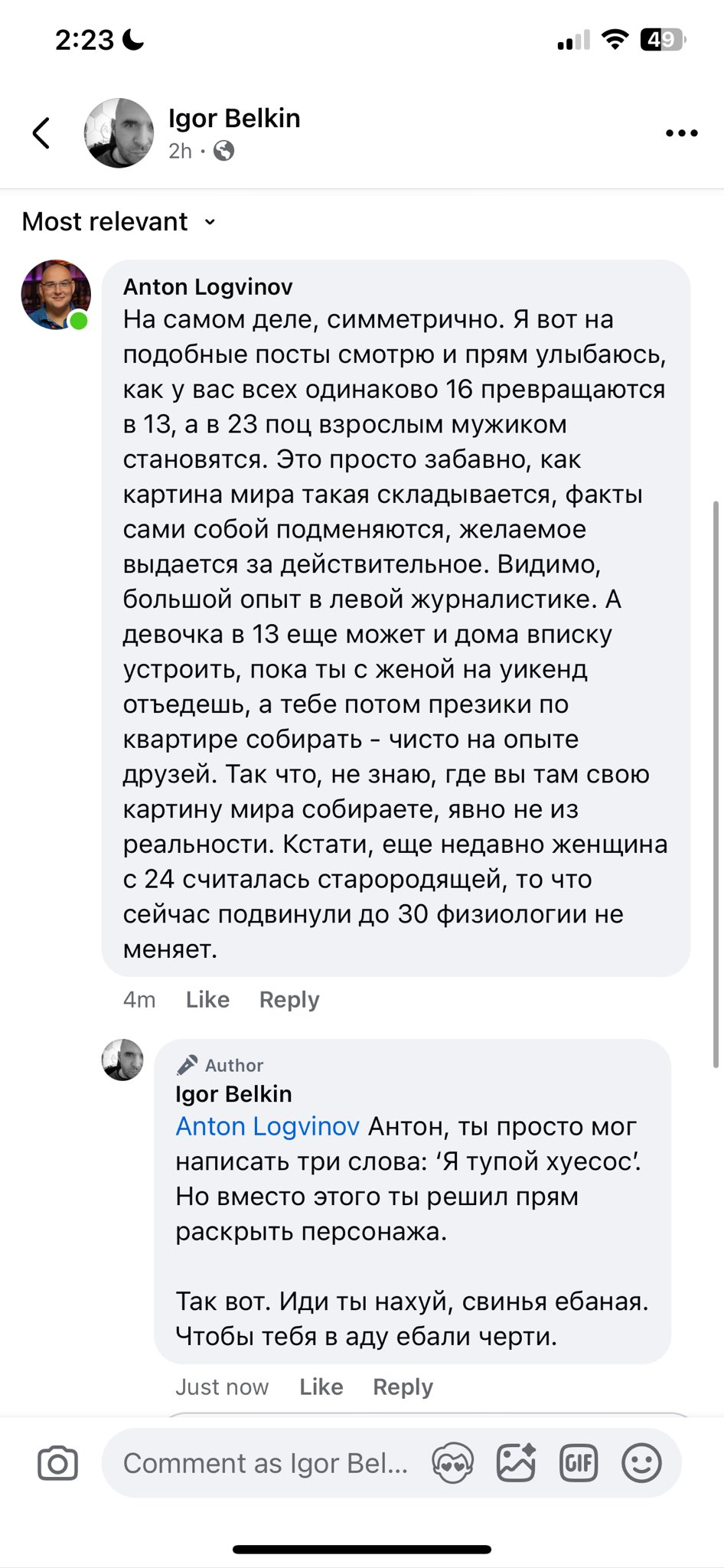 >>998577 Он уже снёс. Повторятся ситуация с чуваком, когда он ночью под мухой угрожал набить лицо, а утром извинялся. хотя судя по маленькой буквы f и странно спрятанной панели комментариев это мог быть фотошоп