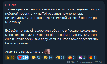 >>994191 Известный в узких кругах транс гилтикус тусил на выставке в Японии, вела стрим. внезапно к ней подваливает наш любитель кроссдрессинга (с которым она видится впервые и вообще не знает, кто это такой) и начинает требовать пояснить за масть и дырявую посуду (предварительно законтачившись через пожатие руки и зашкварившись по собственным же ценностям). В ответ на хамство трапик прописал быдлу в ебучку, за что тот сразу начал ныть "Эт-то че, т-ты чего..."