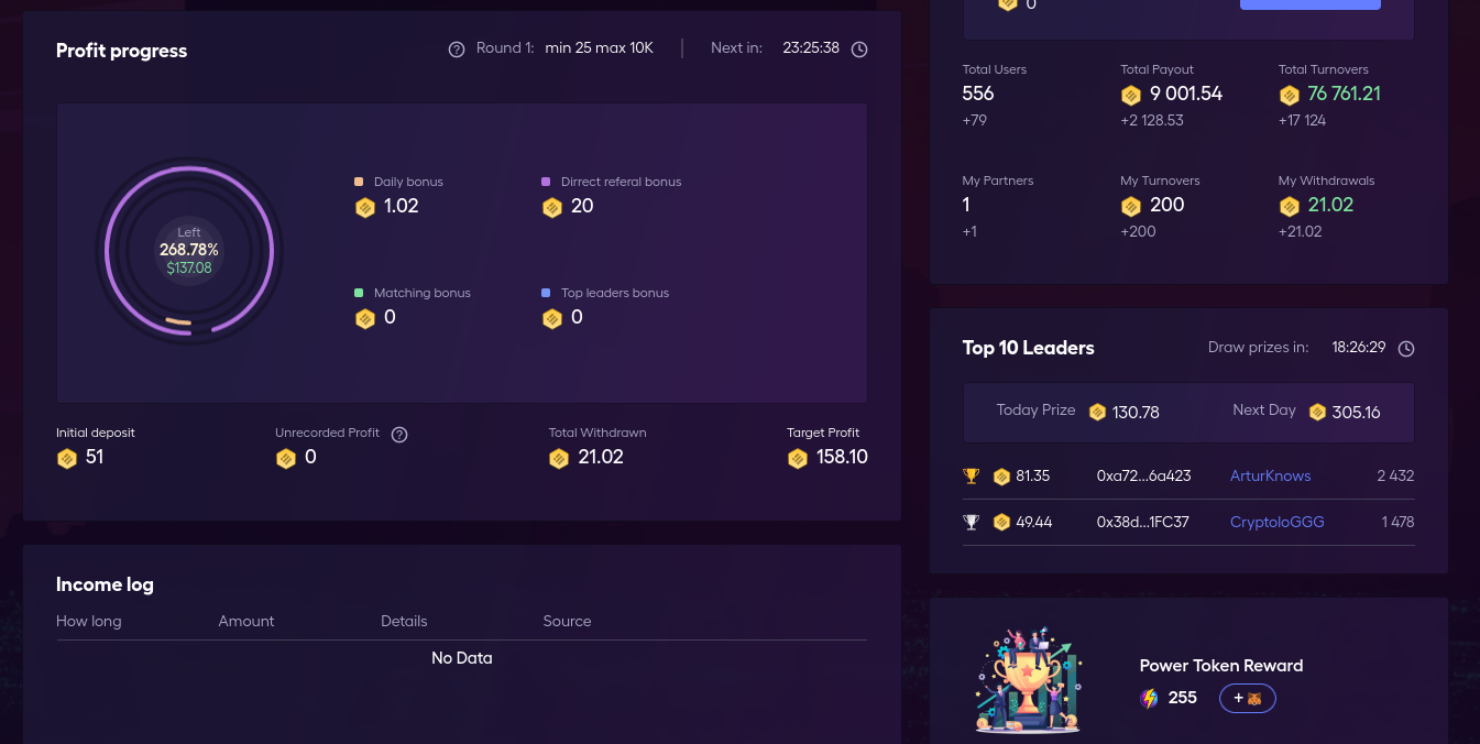 В чем суть: вкладываешь от 25 BUSD, и получаешь по 1% в день. Так около года. Вывод заработанного в любой момент времени. Если приглашать людей - можно заработать больше. Также можно (И НУЖНО!) делать аккаунты под собой, увеличивая свой заработок. Сейчас в проекте всего 500 человек, но скоро пойдет запуск рекламы.