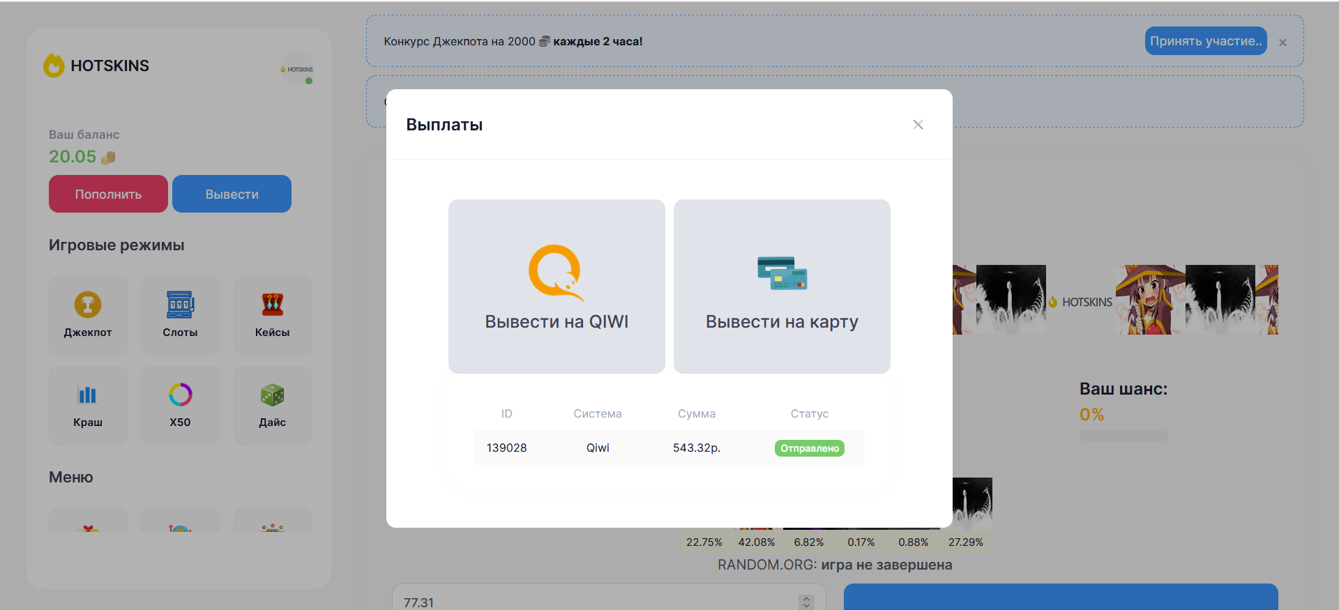Заходим на сайт: https://refhot.fun/?i=165449 После авторизации заходим в раздел Бонусы, подписываемся на группу ВК, привязываем свой Telegram и получаем бонусы (до 100Р). После играем до минимальной суммы вывода (550 рублей) и выводим на свой киви кошелёк. Лично я минималку добил примерно за 7-10 минут, и как говорилось выше, вывел без какого-либо депозита
