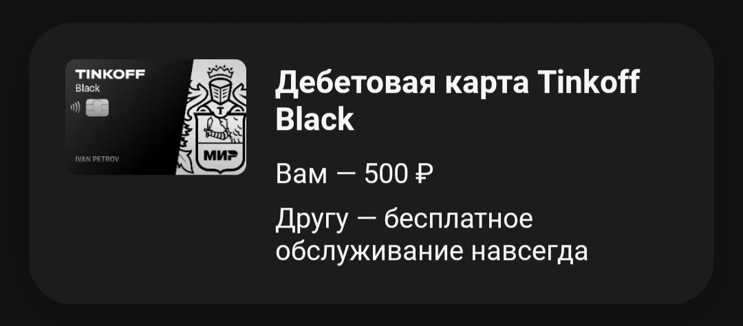 На данный момент предложения следующие: оформите дебетовую/кредитную карту Альфа банка по этим ссылкам https://alfa.me/5al0XgСап / https://alfa.me/rmY9KQ , сделайте первую покупку, и получите от меня половину реферальной награды. Это 500 р. / 750 р. рублей соответственно. Плюс получаете выгодные условия по самим картам. Например, по дебетовке вы получите от банка ещё 500 рублей после первой покупки, а по кредитке год без процентов за траты в первые 30 дней.