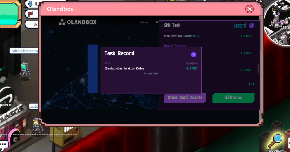 Теперь приступим к сбору Баксов на наш аккаунт.Подходим к зданию участвющем в ивенте нажимаем увеличительно стекло и открывается окошко с таском.Как видите на скрине у этого сдания надо простоять с открытым окошком 15 мин для получения 1го доллара.Такое задание с 1м долларом обновляется раз в сутки,остальные же дают 0,1 бакс,осколки НФТ за 10 которых можно собрать их киборга,а так же их токен СНВголд Теперь насчет вывода баксов,то выводы делают раз в неделю(в конце недели в Субботу)Проверено на себе и вывод есть